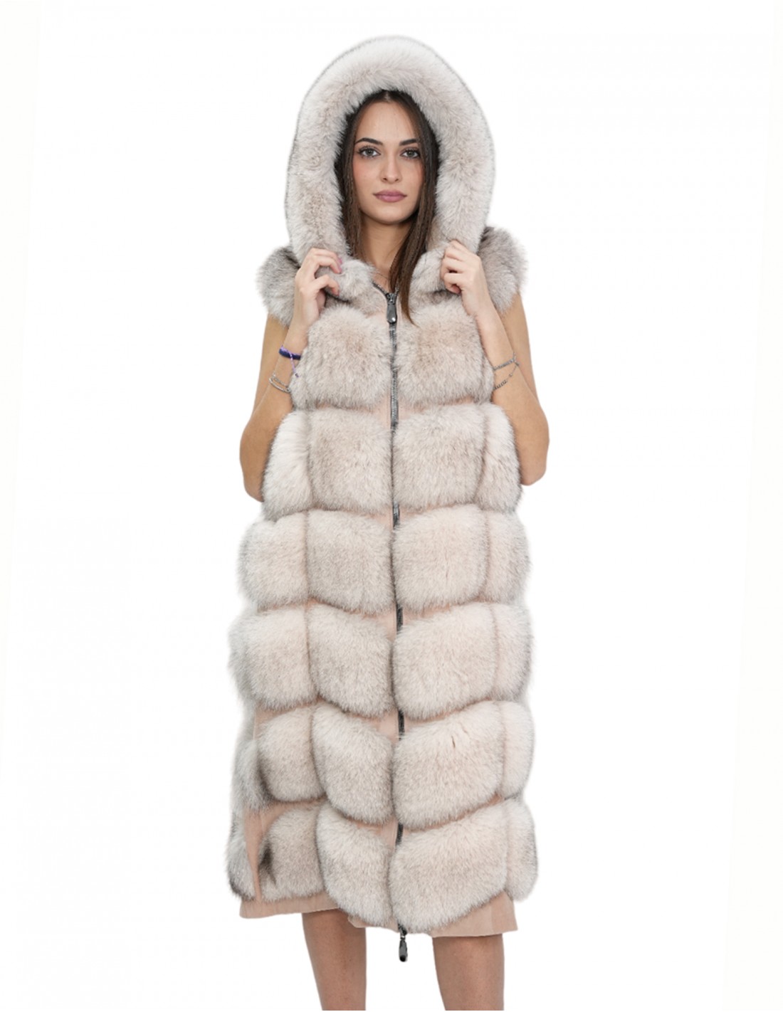 Gilet in pelliccia di volpe a pelli intere. Le nostre pellicce di volpe sono produzioni realizzate dei nostri laboratori, quindi una giacca di volpe unica ed esclusiva. La possibilità di produrre le nostre pellicce di altissima qualità ci consente di fare proposte a differenti prezzi con svariate occasioni a prezzi bassi sempre disponibili. Inoltre i nostri laboratori e le nostre collaborazioni garantiscono una pelliccia di volpe di indiscussa qualità 100% made in italy. La qualità di pelliccia di volpe utilizzata per questa è un gilet di pelliccia di volpe con pelli siglate InModa Pellicceria. Il gilet di pelliccia lungo ben 112 centimetri di volpe e inserimento di pelle vera scamosciata colore rosa si presenta con tasche esterne, chiusura zip e cappuccio foderato in fodera rosa e pelliccia esterna e il tutto in colore rosa.