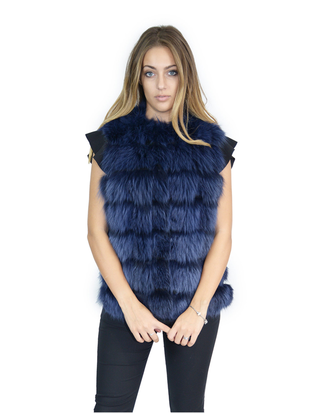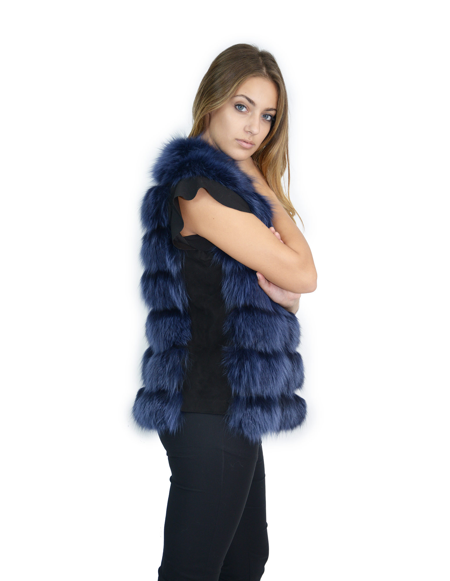Gilet in pelliccia di volpe a pelli intere in lavorazione a orizzontale. Le nostre pellicce di volpe sono produzioni realizzate dei nostri laboratori, quindi una giacca di volpe unica ed esclusiva. La possibilità di produrre le nostre pellicce di altissima qualità ci consente di fare proposte a differenti prezzi con svariate occasioni a prezzi bassi sempre disponibili. Inoltre i nostri laboratori e le nostre collaborazioni garantiscono una pelliccia di volpe di indiscussa qualità 100% made in italy. La qualità di pelliccia di volpe utilizzata per questa è un gilet di pelliccia di volpe con pelli siglate InModa Pellicceria. Il gilet di pelliccia lungo 64 centimetri di volpe e inserimento di pelle vera scamosciata colore nero si presenta con tasche esterne, chiusura ganci e senza collo o collo “chanel” e il tutto in colore blu acceso.