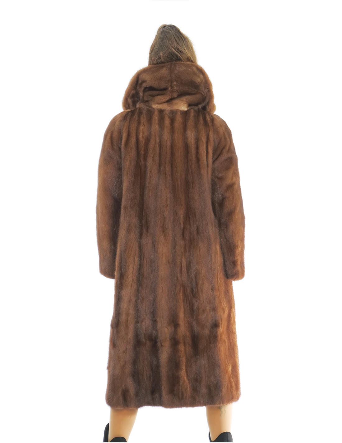 Cappotto lunghissimo in visone verticale 114 centimetri con manica a tre quarti, collo sciallato largo, chiusura ganci, tasche esterne, fodera marrone scuro.