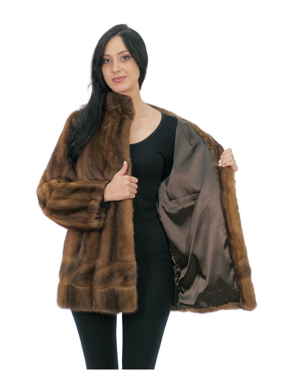 Giacca in pelliccia di visone a pelli intere verticali con una fascia orizzontale a V sul fondo, si presenta a manica lunga chiusura ganci, tasche esterne e fodera marrone scuro.