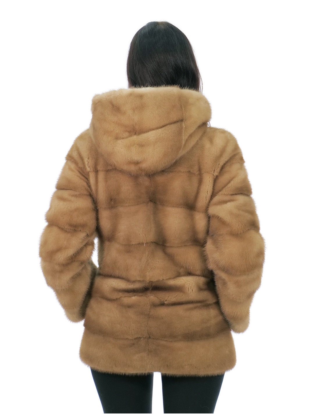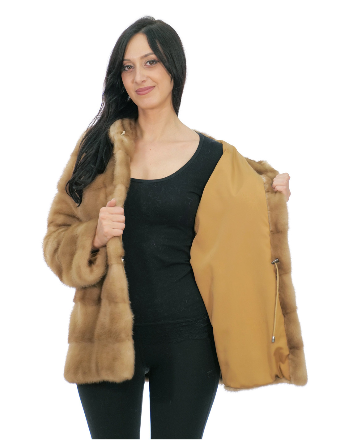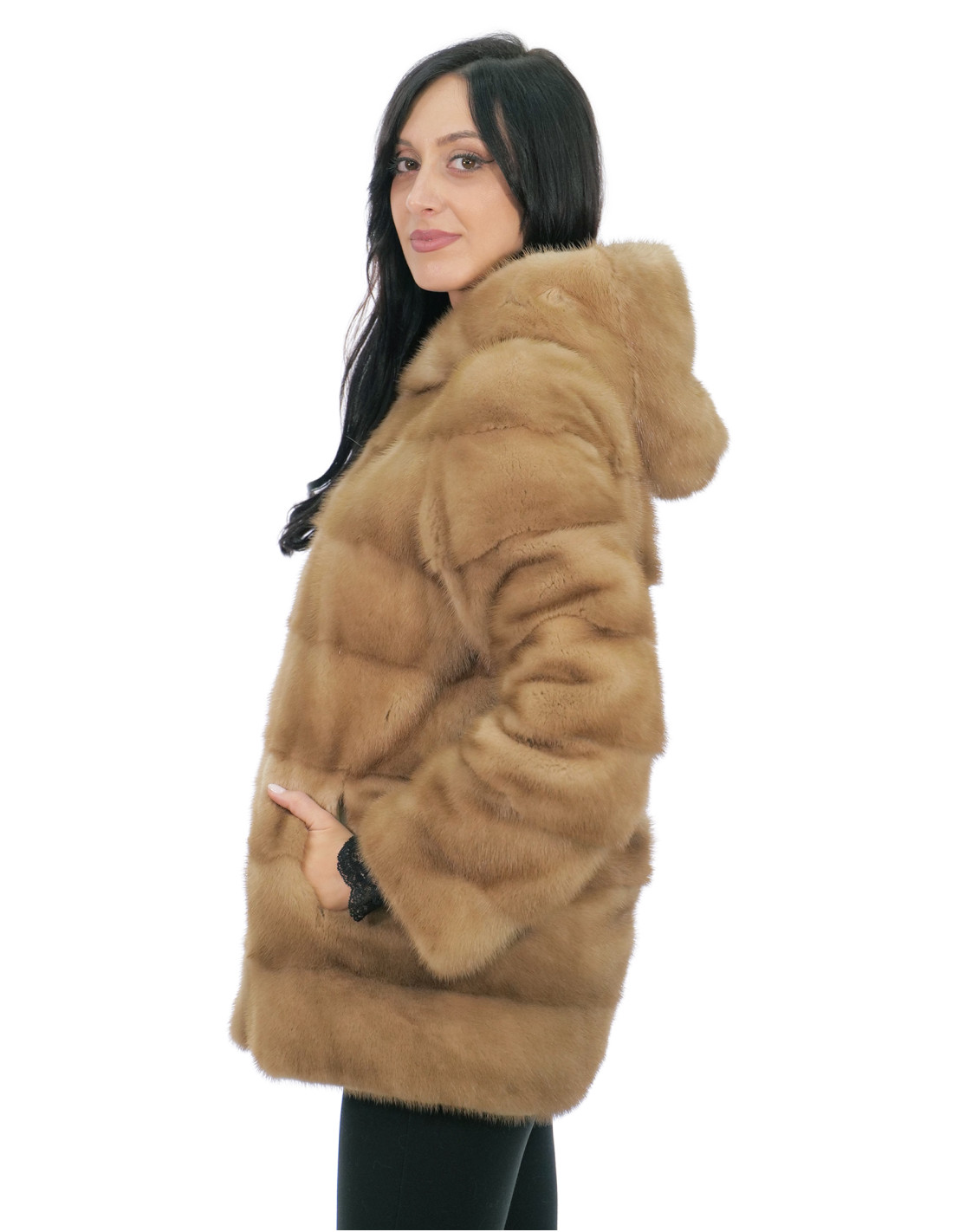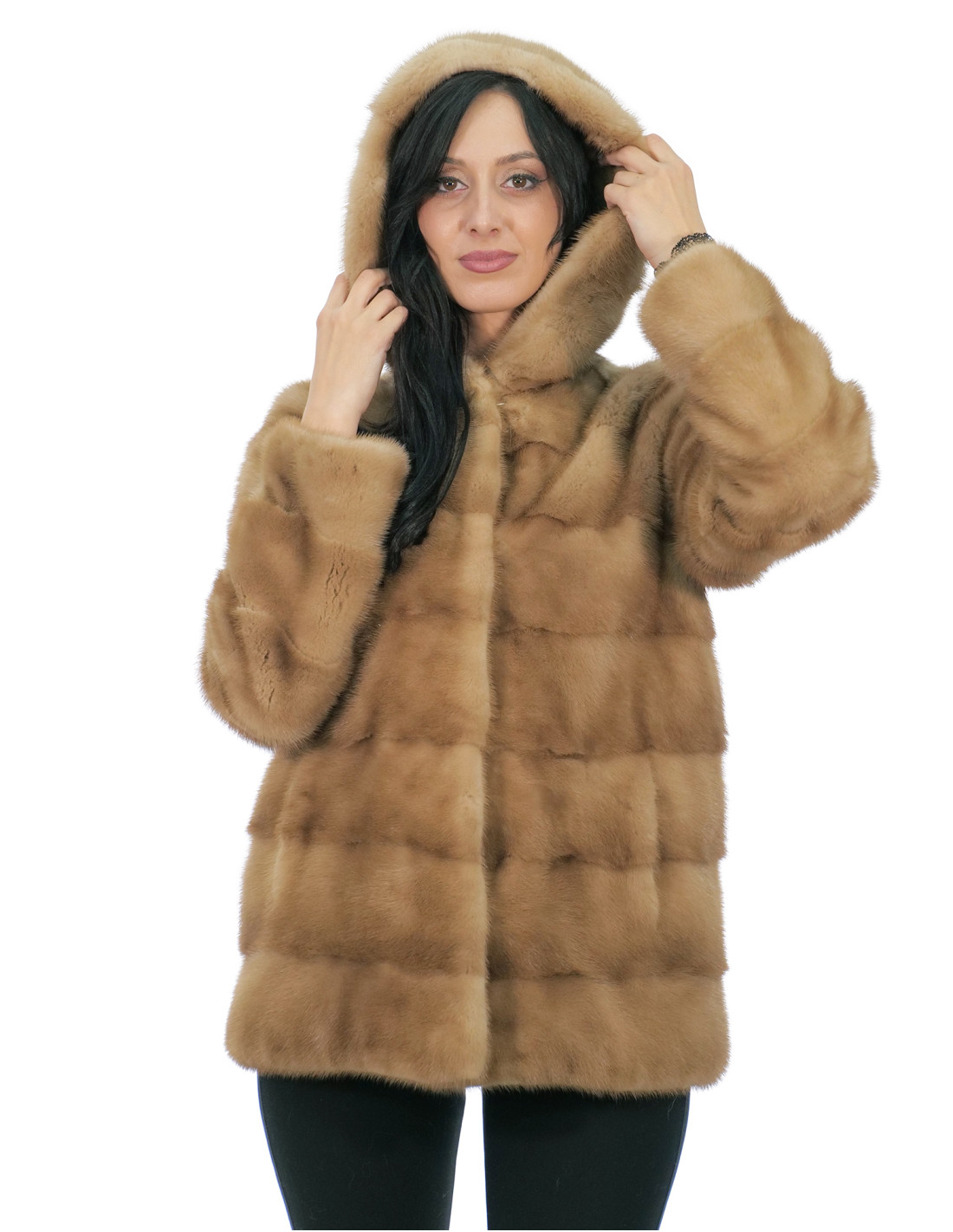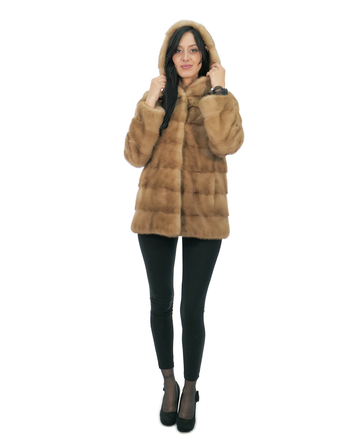 Cappotto in pelliccia di visone a pelli intere con lavorazione orizzontale. Le nostre pellicce di visone sono produzioni realizzate dei nostri laboratori, quindi una giacca di visone unica ed esclusiva. La possibilità di produrre le nostre pellicce di altissima qualità ci consente di fare proposte a differenti prezzi con svariate occasioni a prezzi bassi sempre disponibili. Inoltre i nostri laboratori e le nostre collaborazioni garantiscono una pelliccia di visone di indiscussa qualità 100% made in italy. La qualità di pelliccia di visone femmina utilizzata per questa è una giacca di pelliccia di visone con pelli siglate Saga furs. La giacca di pelliccia di visone in lavorazione orizzontale lunga 70 centimetri si presenta con tasche esterne laterali, chiusura con ganci, cappuccio foderato in pelli di visone, il tutto in color redglow.,