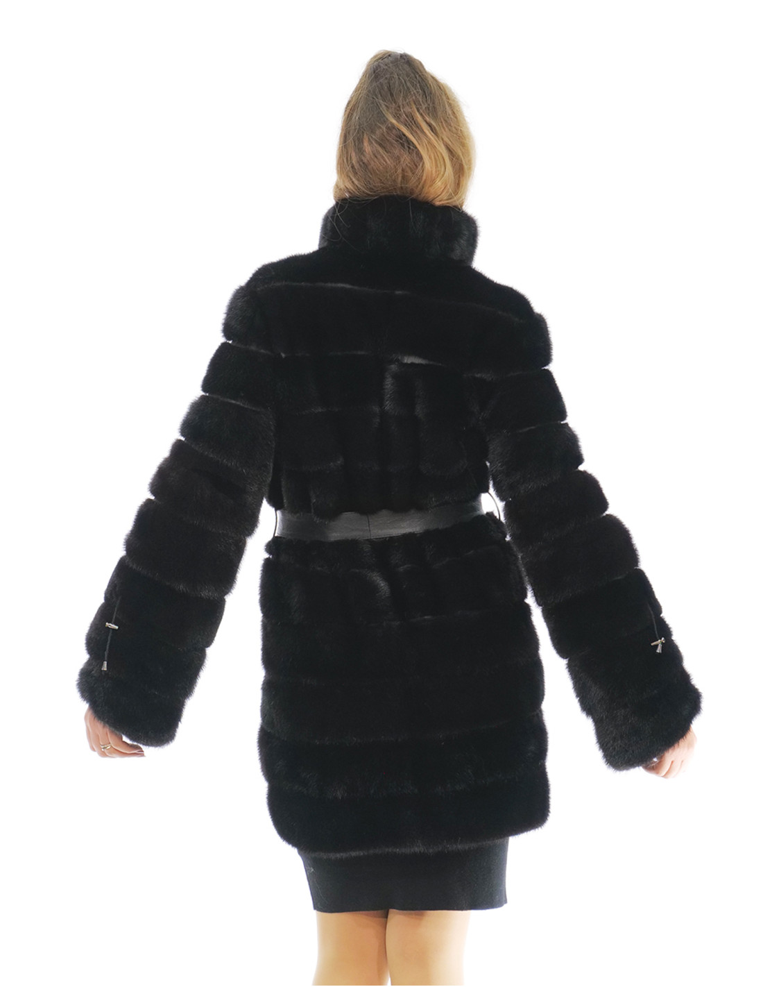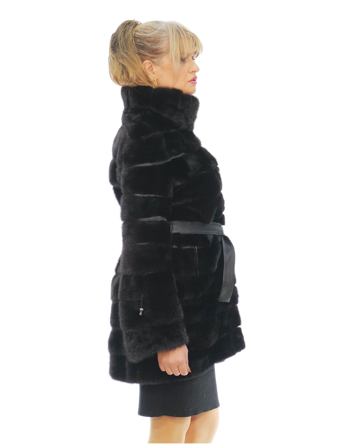 Cappotto in pelliccia di visone a pelli intere con lavorazione orizzontale. Le nostre pellicce di visone sono produzioni realizzate dei nostri laboratori, quindi una giacca di visone unica ed esclusiva. La possibilità di produrre le nostre pellicce di altissima qualità ci consente di fare proposte a differenti prezzi con svariate occasioni a prezzi bassi sempre disponibili. Inoltre i nostri laboratori e le nostre collaborazioni garantiscono una pelliccia di visone di indiscussa qualità 100% made in italy. La qualità di pelliccia di visone femmina utilizzata per questa è una giacca di pelliccia di visone con pelli siglate InModa Pellicceria. La giacca di pelliccia di visone in lavorazione orizzontale lunga 88 centimetri, manica lunga con coulisse all’altezza dei gomiti, chiusura con ganci interni, cintura in pelle in vita esterna, collo pistagna, tasche esterne, il tutto colore nero.
