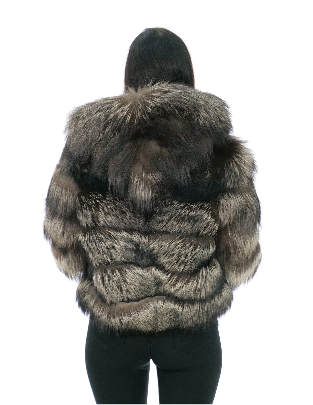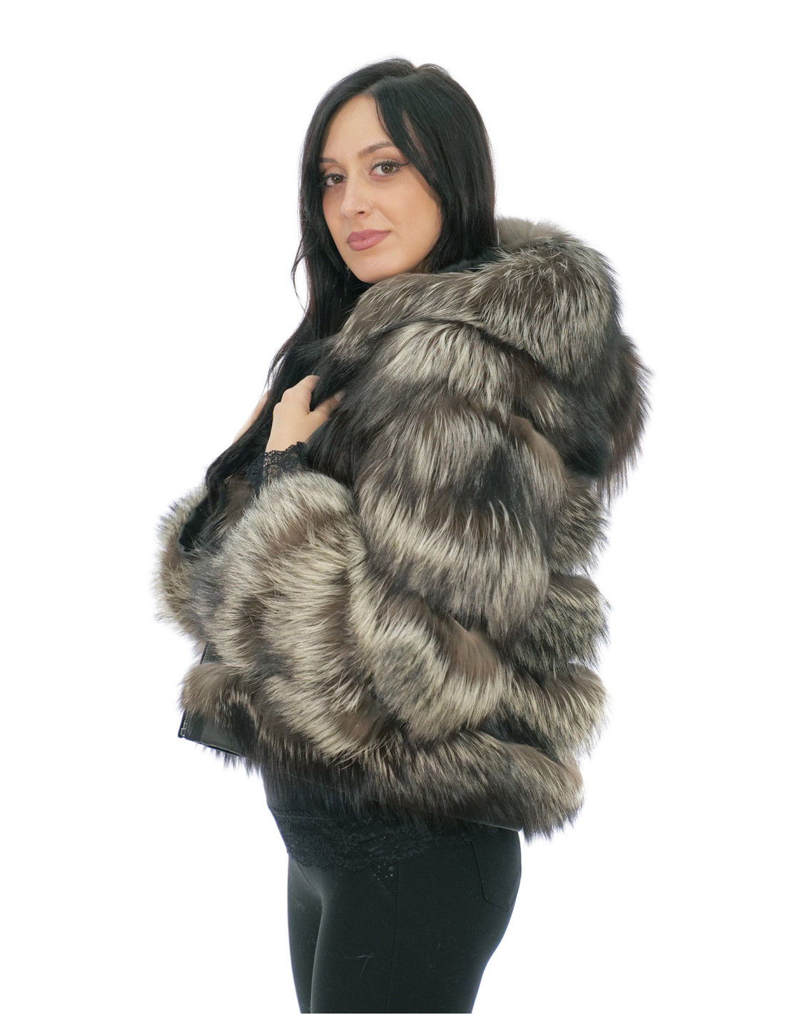 Giacca di pelliccia di volpe a pelli intere in lavorazione orizzontale. Le nostre pellicce di volpe sono produzioni realizzate dei nostri laboratori, quindi una giacca di volpe unica ed esclusiva. La possibilità di produrre le nostre pellicce di altissima qualità ci consente di fare proposte a differenti prezzi con svariate occasioni a prezzi bassi sempre disponibili. Inoltre i nostri laboratori e le nostre collaborazioni garantiscono una pelliccia di volpe di indiscussa qualità 100% made in italy. La qualità di pelliccia di volpe utilizzata per questa è una giacca di pelliccia di volpe con pelli siglate InModa Pellicceria. La giacca di pelliccia di volpe si presenta in lavorazione orizzontale con inserti di vera pelle, con tasche esterne, con chiusura zip, cappuccio vaporoso in volpe foderato internamente di pelliccia di colore nero, manica lunga, il tutto in colore argentata sul nero e grigio.