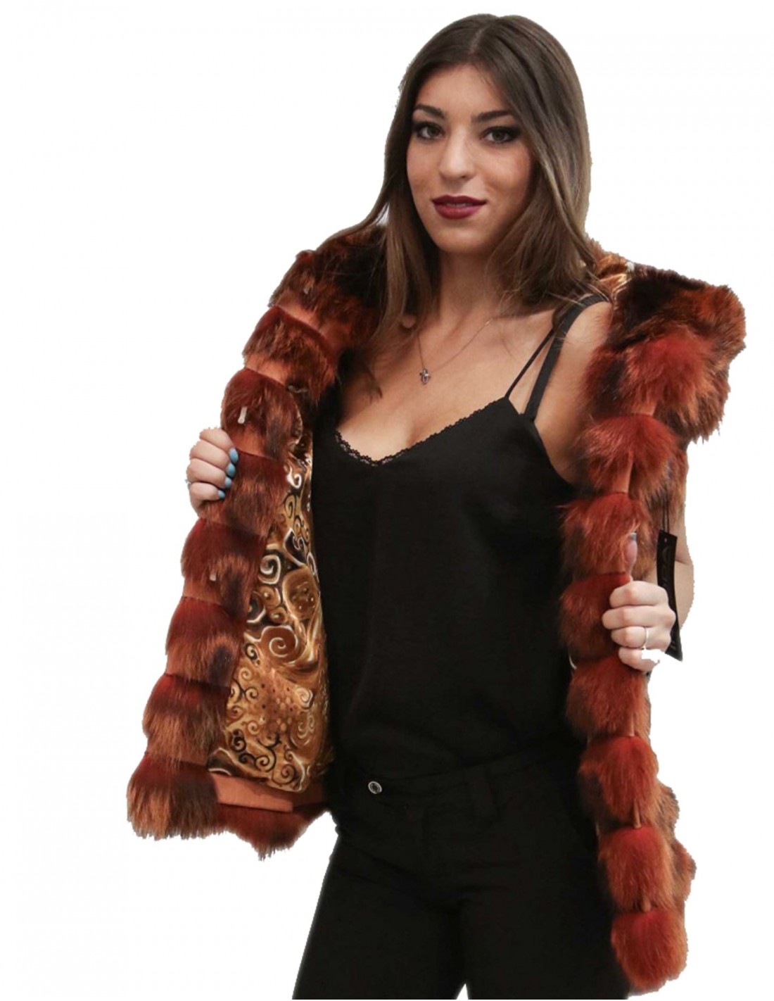 Pelliccia gilet di marmotta color ruggine lavorazione orizzontale con cappuccio