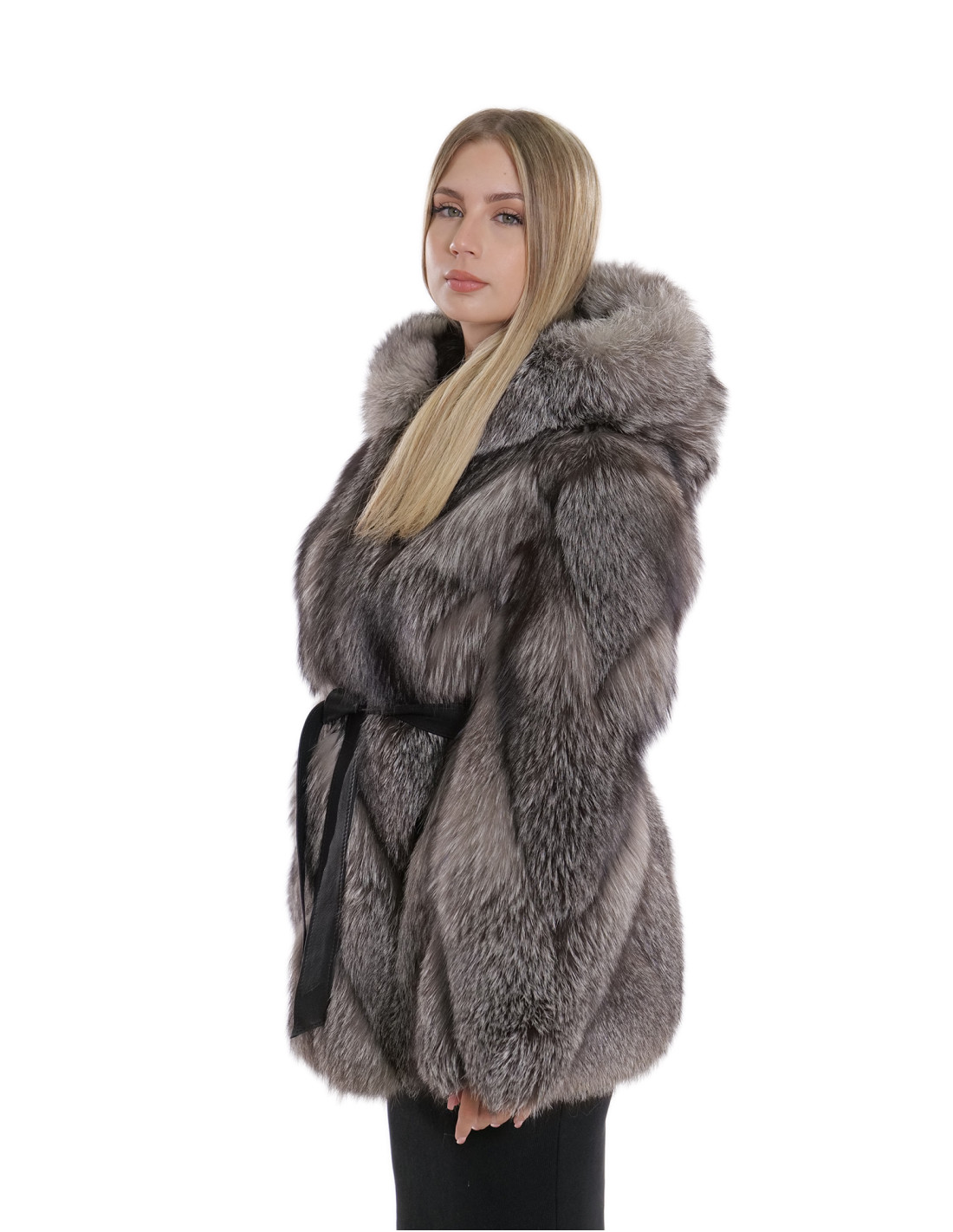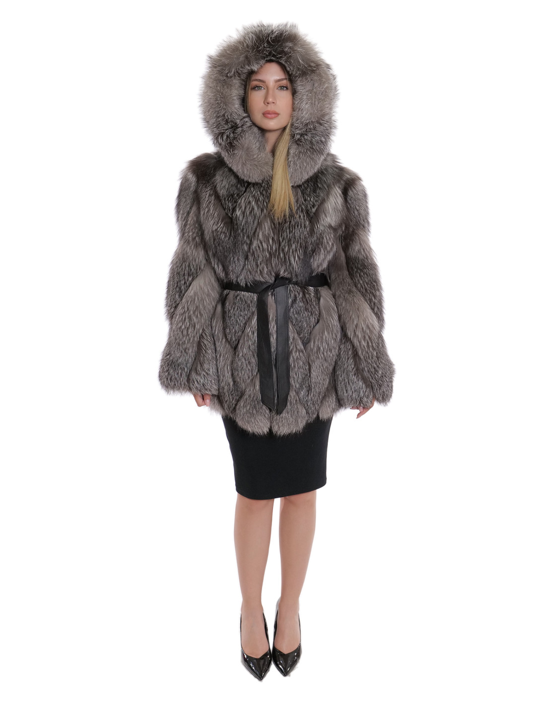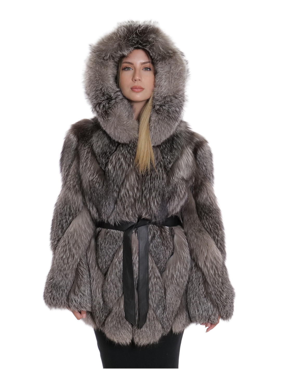 Куртка из меха лисы цельными шкурками в поперечной обработке. Наши меха лисы производятся в наших лабораториях, поэтому это уникальная и эксклюзивная куртка из лисы. Возможность производства наших мехов высочайшего качества позволяет нам делать предложения по разным ценам, при этом всегда доступны различные возможности по низким ценам. Кроме того, наши лаборатории и наше сотрудничество гарантируют мех лисы бесспорного качества, 100% произведенный в Италии. Для этого использован мех лисы — куртка из меха лисы со шкурами с подписью InModa Pellicceria. Куртка из лисьего меха поперечной обработки со вставками из натуральной кожи, с внешними карманами, застежкой на крючки, капюшоном из лисицы как внутри, так и снаружи, рукавами 3/4, внешним черным замшевым кожаным ремнем, все в серебристом цвете.
