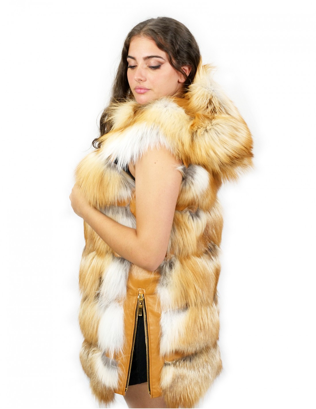 Меховой жилет из лисы, цельные шкурки. Наши лисьи меха производятся в наших мастерских, поэтому это уникальная и эксклюзивная куртка из лисы. Возможность производства наших мехов самого высокого качества позволяет нам делать предложения по разным ценам с различными случаями по низким ценам всегда в наличии. Кроме того, наши лаборатории и наше сотрудничество гарантируют лисий мех неоспоримого качества, 100% итальянского производства. Качество меха песца, используемого для этого, — жилет из меха песца с фирменными шкурами InModa Pellicceria. Жилет из меха лисы со вставками из натуральной коричневой кожи имеет внешние карманы, застежку-молнию и капюшон с подкладкой из кожи и меха натурального оранжевого оттенка черного цвета, мех также имеет две молнии по бокам и для создания одного бокового разреза.