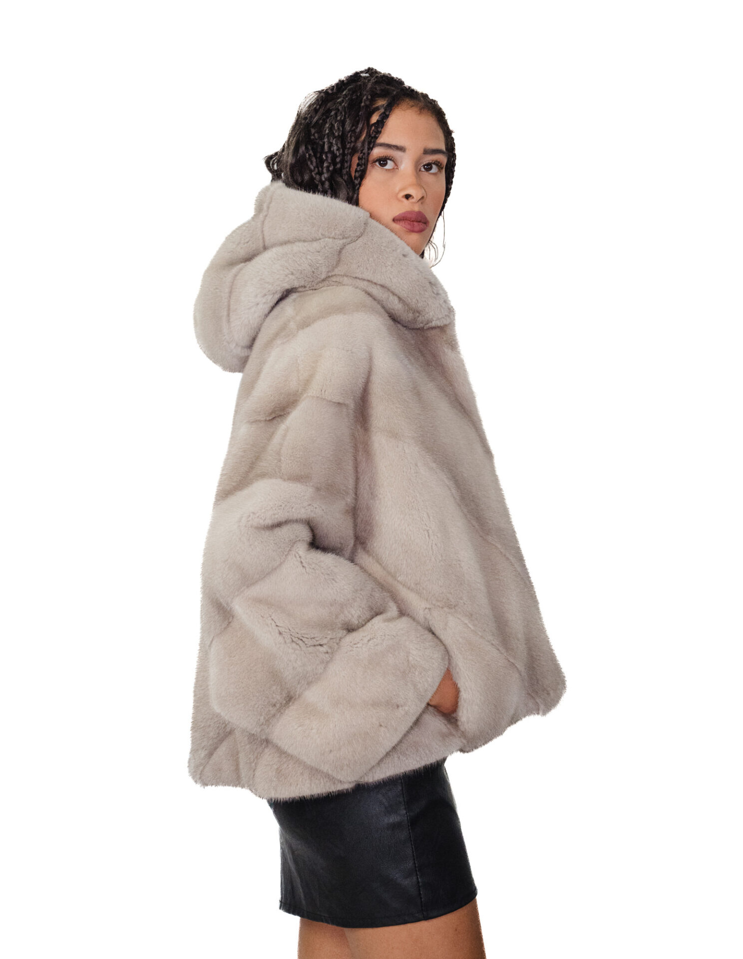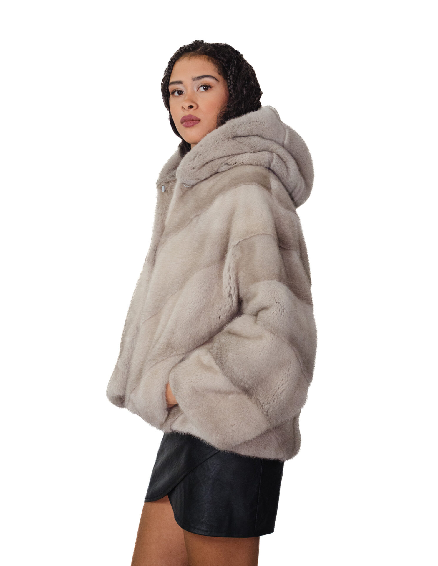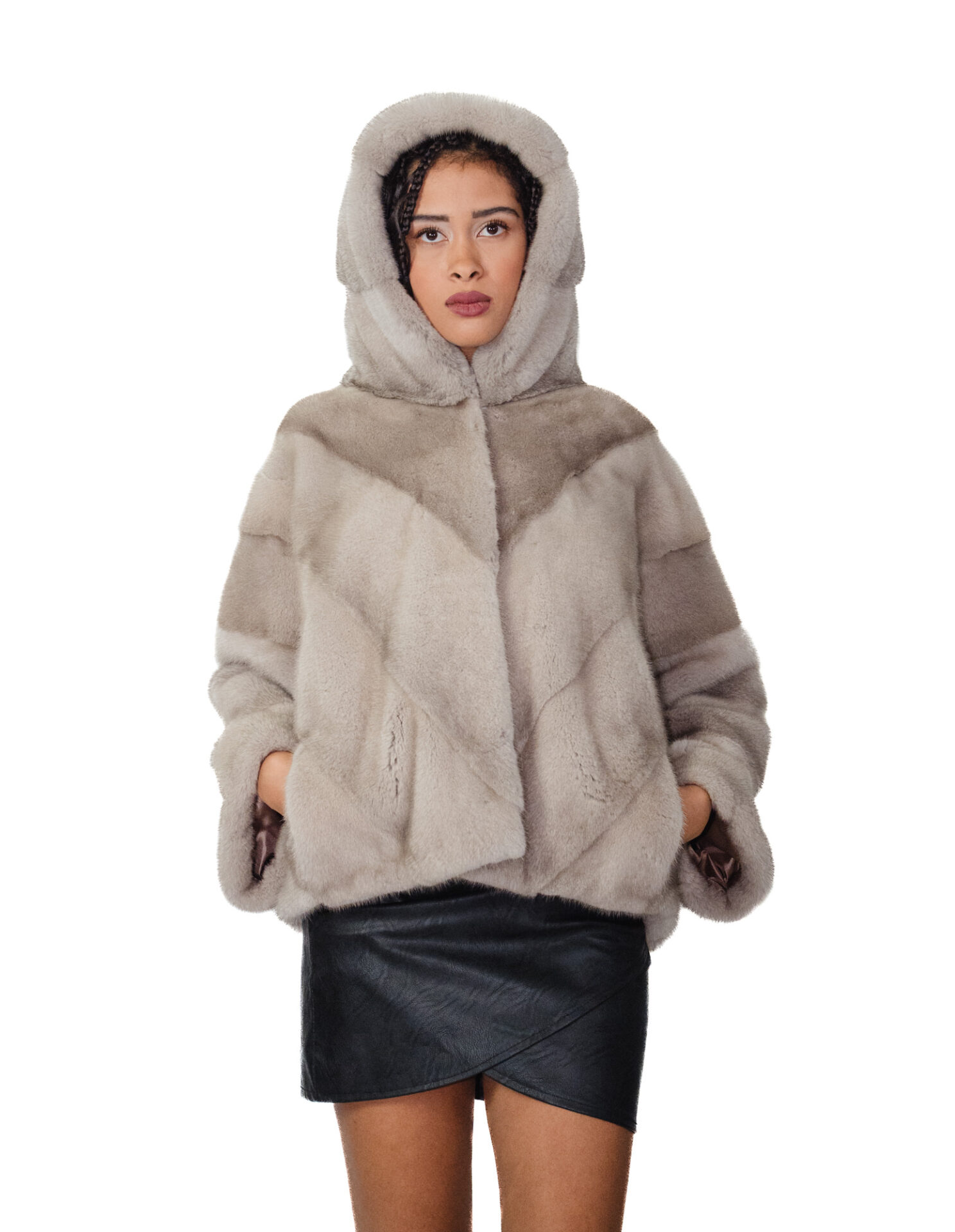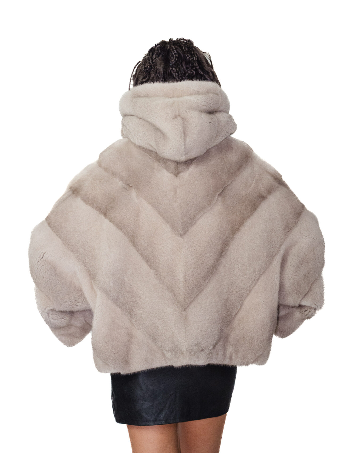 Накидка из цельных шкурок норки в горизонтальной V-образной обработке. Наши норковые меха производятся в наших лабораториях, поэтому это уникальные и эксклюзивные норковые жакеты. Возможность производить меховые изделия высочайшего качества позволяет нам делать предложения по разным ценам, при этом всегда можно найти множество выгодных предложений по низким ценам. Более того, наши мастерские и партнерские отношения гарантируют норковый мех бесспорного 100%-ного качества, произведенного в Италии. Для этого использован мех женской норки — шуба из норки со шкурками с подписью InModa Pellicceria. Норковая шуба короткая, всего 60 сантиметров, горизонтальной V-образной конструкции, с красивым капюшоном на норковой подкладке, застежкой на крючки, обычными внешними карманами, красивой накидкой с рукавами три четверти, широкого кроя, рассчитанного на размер от 42 до 60, подходит как на маленькие, так и на большие размеры, все в светло-сером цвете.