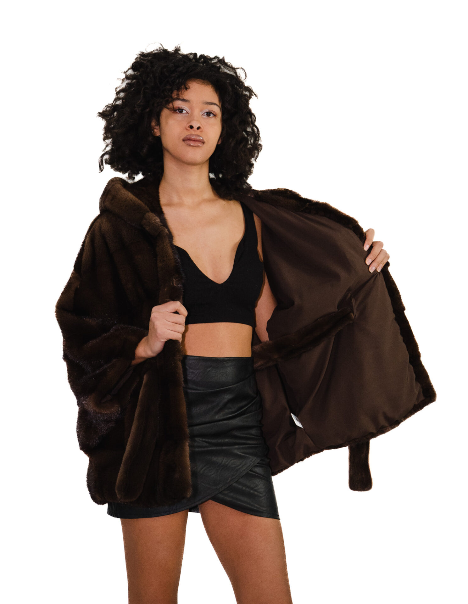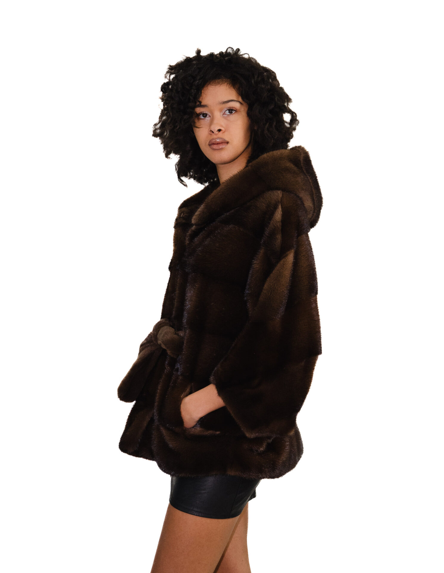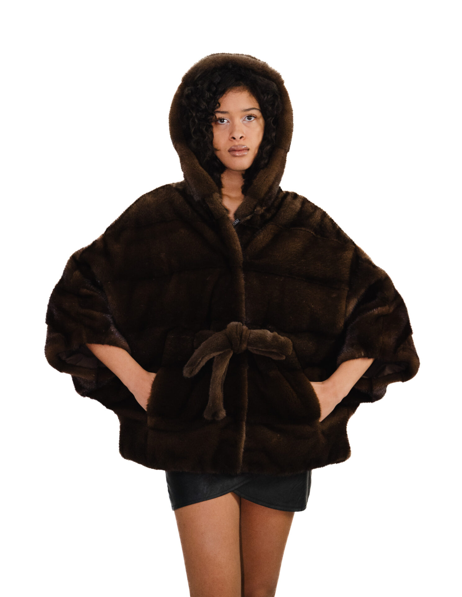 Горизонтальная накидка из цельной норковой шкуры. Наши норковые меха производятся в наших собственных мастерских, что позволяет получить уникальную и эксклюзивную норковую куртку. Возможность производить меховые изделия высочайшего качества позволяет нам делать предложения по разным ценам, при этом всегда можно найти множество выгодных предложений по низким ценам. Более того, наши мастерские и партнерские отношения гарантируют норковый мех бесспорного 100%-ного качества, произведенного в Италии. Качество меха женской норки, использованного для этой куртки, — это мех норки, шкурки которой имеют маркировку Saga Furs. Накидка из норки длиной 72 см, выполненная в горизонтальном порядке, с рукавами 3/4, внутренней застежкой на крючок и капюшоном, подкладкой из черного норкового меха, меховым поясом на внутренней стороне талии, внешними карманами, все в коричневом цвете «деми-бафф».