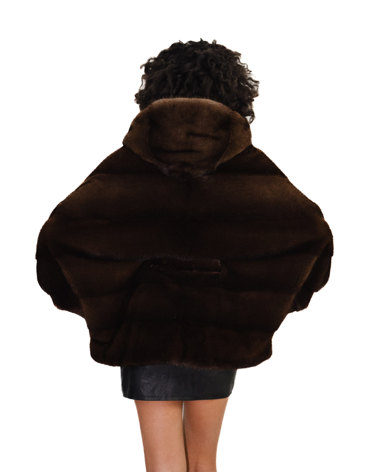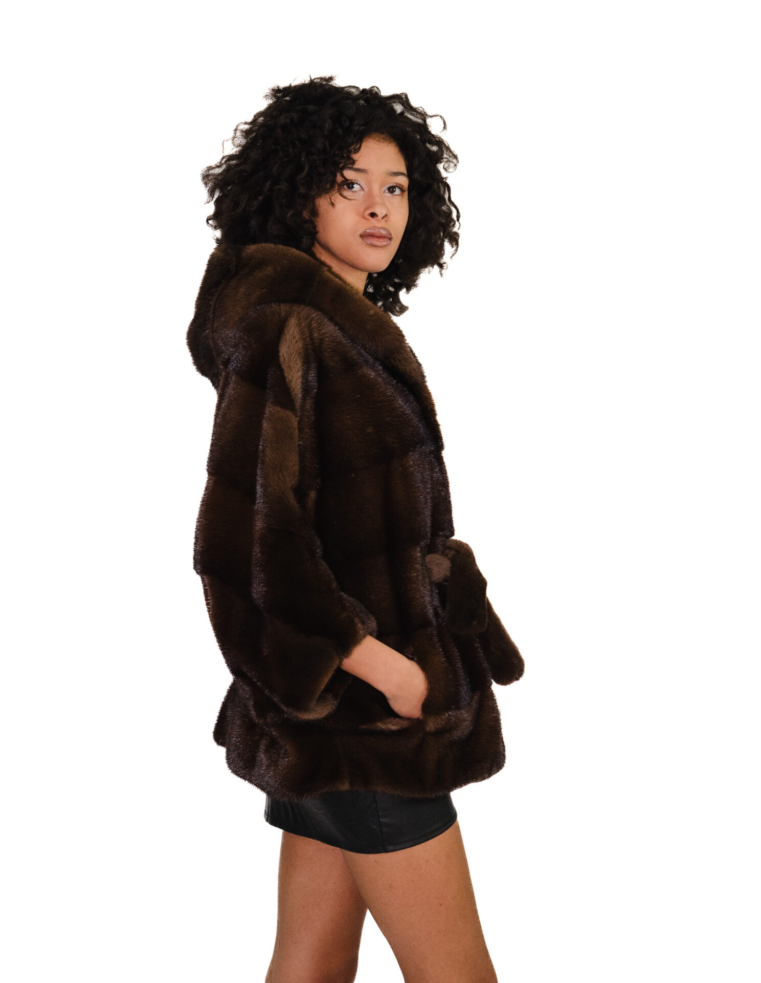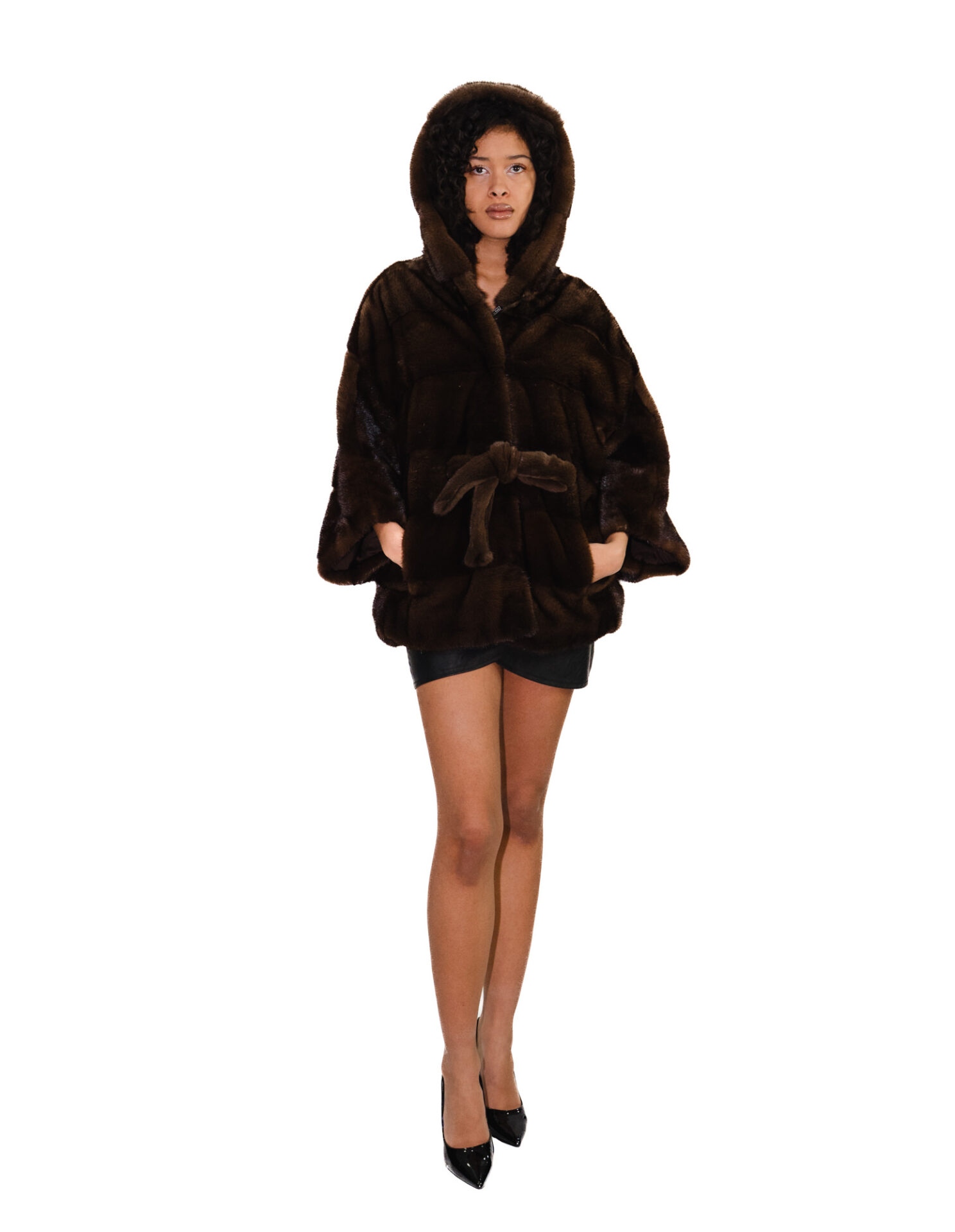 Горизонтальная накидка из цельной норковой шкуры. Наши норковые меха производятся в наших собственных мастерских, что позволяет получить уникальную и эксклюзивную норковую куртку. Возможность производить меховые изделия высочайшего качества позволяет нам делать предложения по разным ценам, при этом всегда можно найти множество выгодных предложений по низким ценам. Более того, наши мастерские и партнерские отношения гарантируют норковый мех бесспорного 100%-ного качества, произведенного в Италии. Качество меха женской норки, использованного для этой куртки, — это мех норки, шкурки которой имеют маркировку Saga Furs. Накидка из норки длиной 72 см, выполненная в горизонтальном порядке, с рукавами 3/4, внутренней застежкой на крючок и капюшоном, подкладкой из черного норкового меха, меховым поясом на внутренней стороне талии, внешними карманами, все в коричневом цвете «деми-бафф».