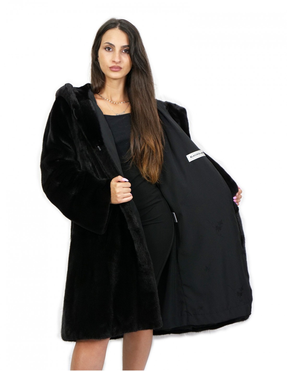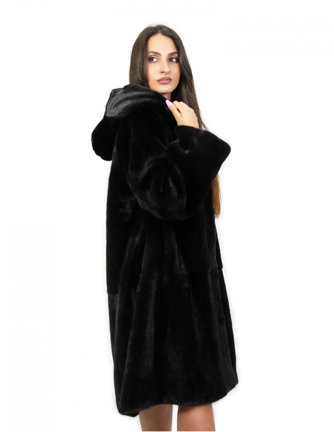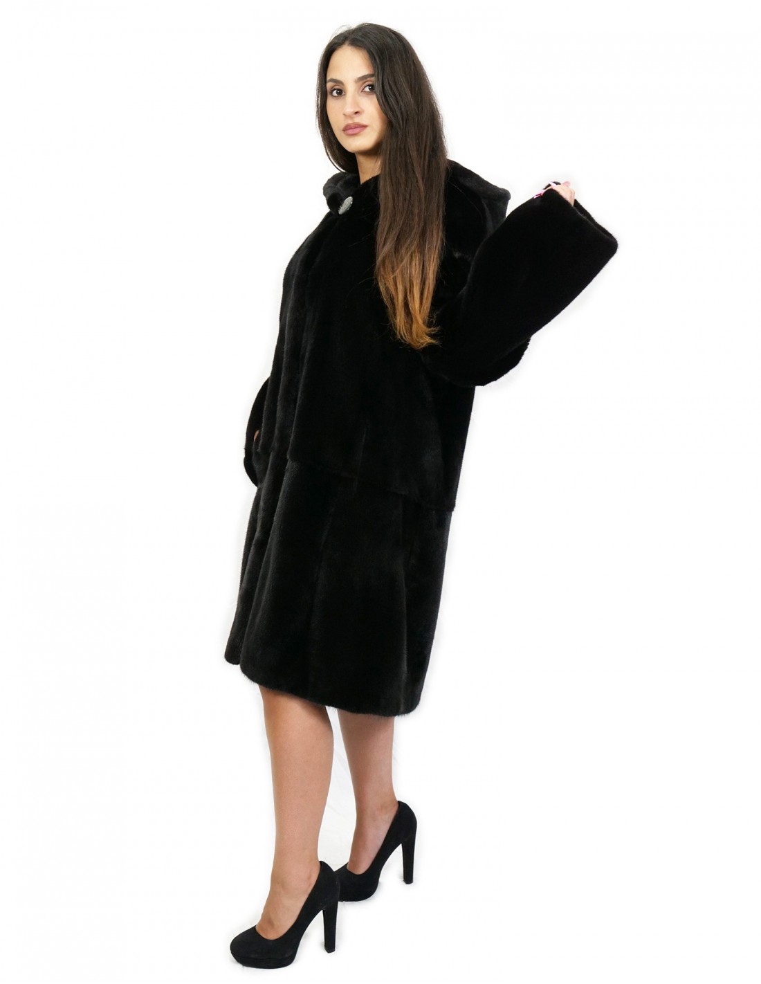 Норковая шуба, цельные шкурки. Наши норковые меха производятся в наших мастерских, поэтому это уникальная и эксклюзивная норковая шуба. Возможность производства наших мехов самого высокого качества позволяет нам делать предложения по разным ценам с различными случаями по низким ценам всегда в наличии. Кроме того, наши лаборатории и наше сотрудничество гарантируют мех норки неоспоримого качества, 100% итальянского производства. Качество женского меха норки, используемого для этого, — норковая шуба с фирменными шкурами Blackglama. Куртка из норкового меха длиной 100 см с наружными карманами, застежкой на крючки и капюшоном на подкладке из норковых шкур, длинными рукавами, черного цвета.