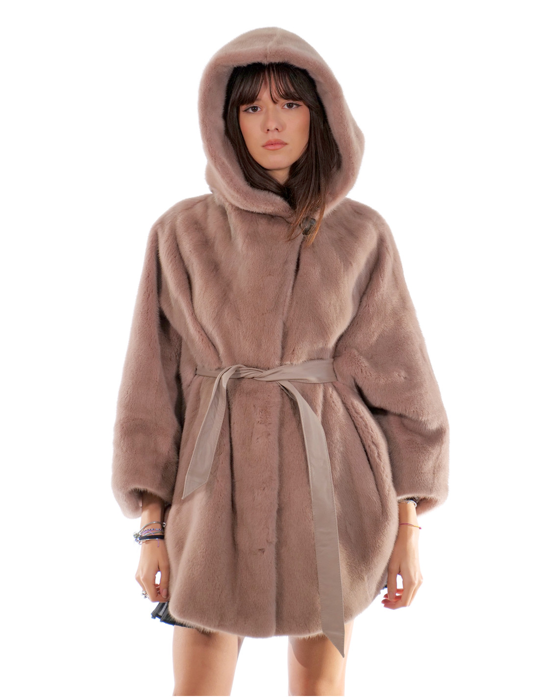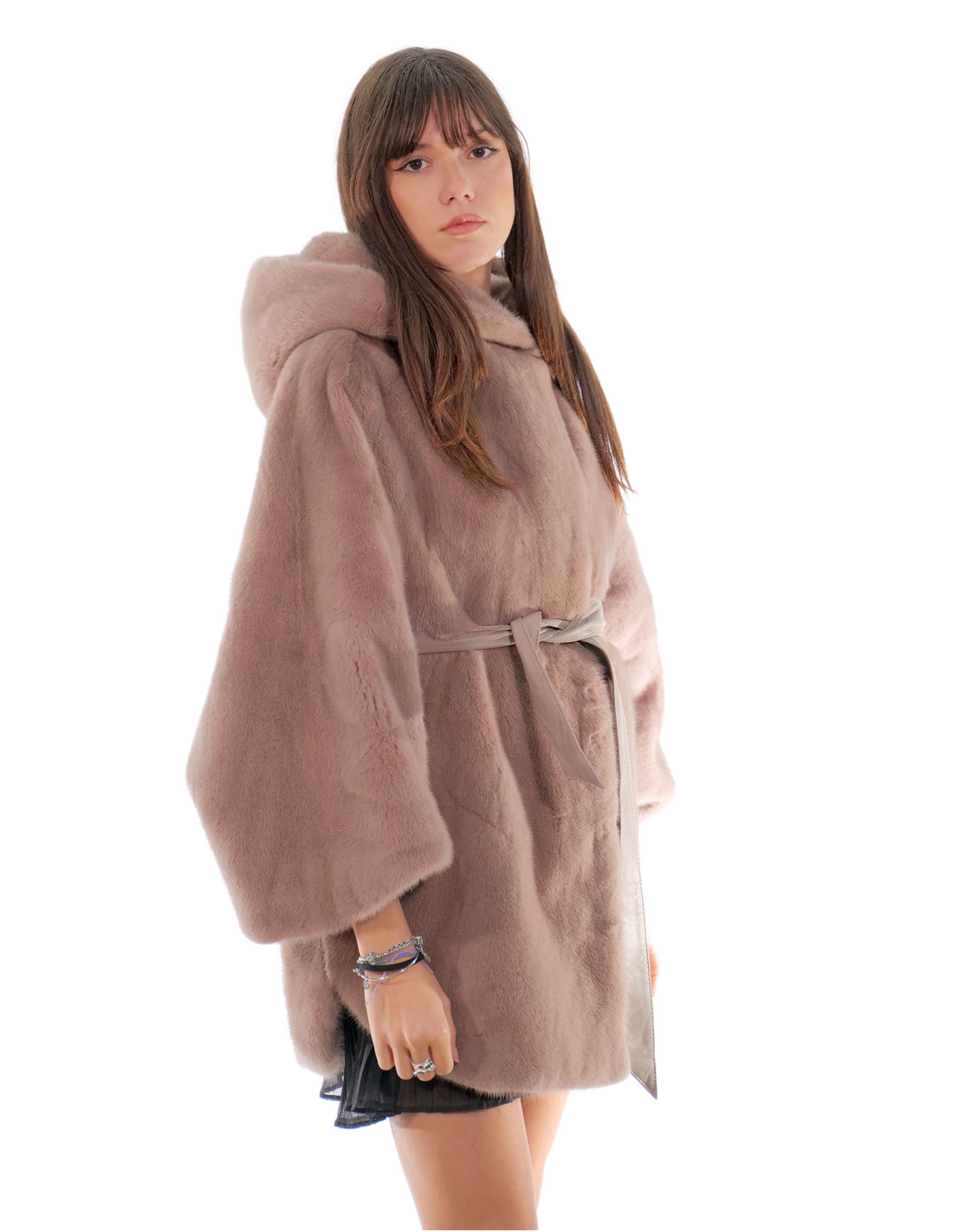 Норковая накидка из цельных шкурок в процессе изготовления. Наши норковые меха производятся в наших лабораториях, поэтому это уникальные и эксклюзивные норковые жакеты. Возможность производства наших мехов высочайшего качества позволяет нам делать предложения по разным ценам, при этом всегда доступны различные возможности по низким ценам. Кроме того, наши лаборатории и наше сотрудничество гарантируют мех норки бесспорного качества, 100% произведенный в Италии. Для этого использован мех женской норки — шуба из норки с фирменными шкурками Saga Furs. Норковая шуба выполнена в горизонтальной обработке великолепного серо-голубого на розовом цвете, с красивым капюшоном на подкладке из норки, застежкой на крючок и пуговицы на шее, обычными внешними карманами, внутренним кожаным ремнем, красивой накидкой с рукавами.