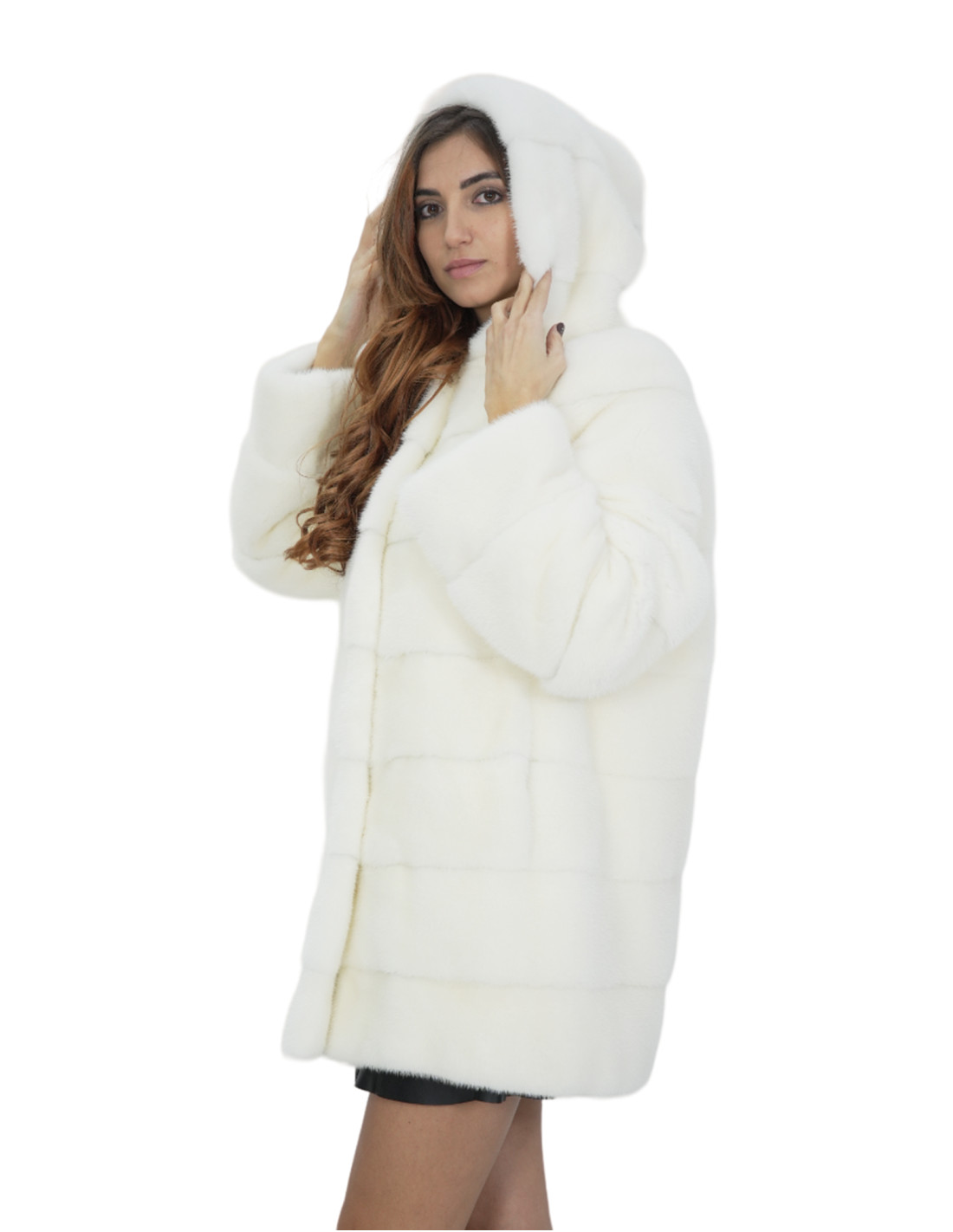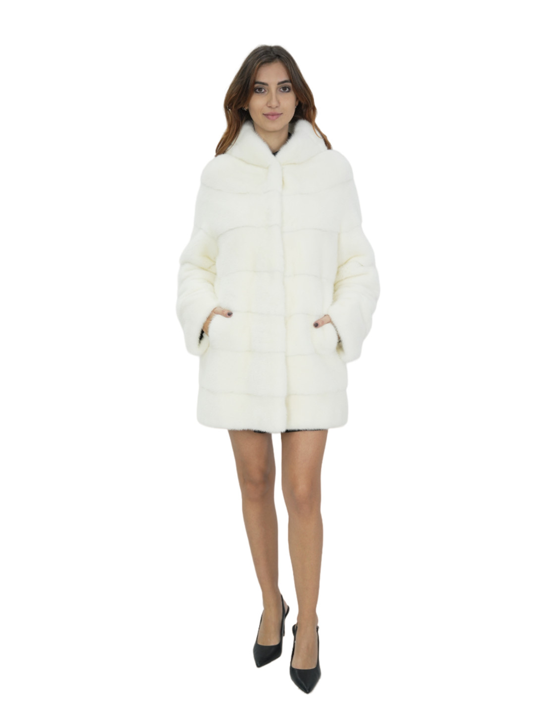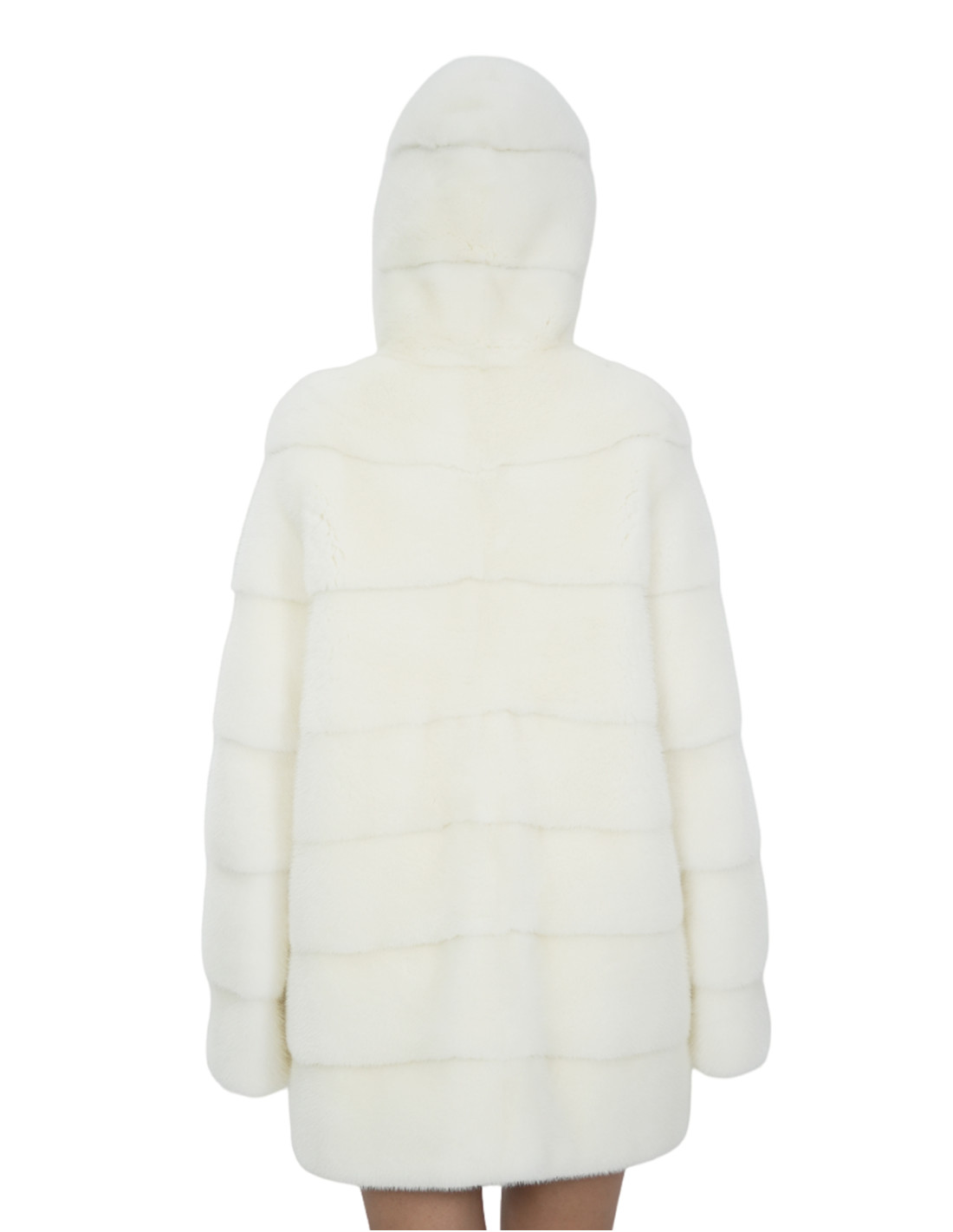Шуба из норки из цельных шкурок с горизонтальной обработкой. Наши норковые меха производятся в наших лабораториях, поэтому это уникальные и эксклюзивные норковые жакеты. Возможность производства наших мехов высочайшего качества позволяет нам делать предложения по разным ценам, при этом всегда доступны различные возможности по низким ценам. Кроме того, наши лаборатории и наше сотрудничество гарантируют мех норки бесспорного качества, 100% произведенный в Италии. Для этого использован мех женской норки — шуба из норки со шкурками марки Copenhagen Furs. Норковая шуба в горизонтальной обработке, длина 80 см, длинные рукава, застежка на крючки, боковые карманы, капюшон на подкладке из норкового меха, все в оптическом белом цвете.