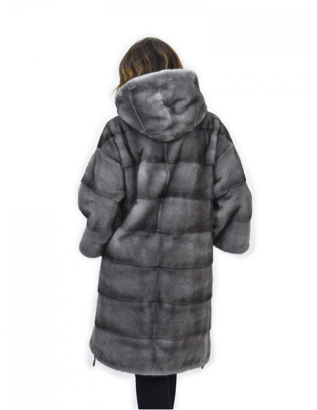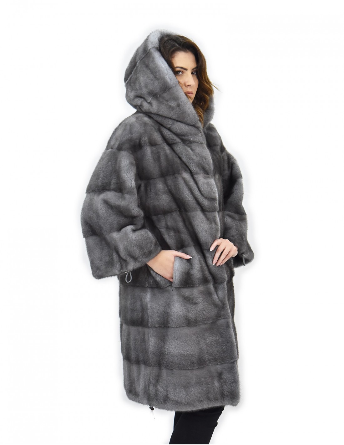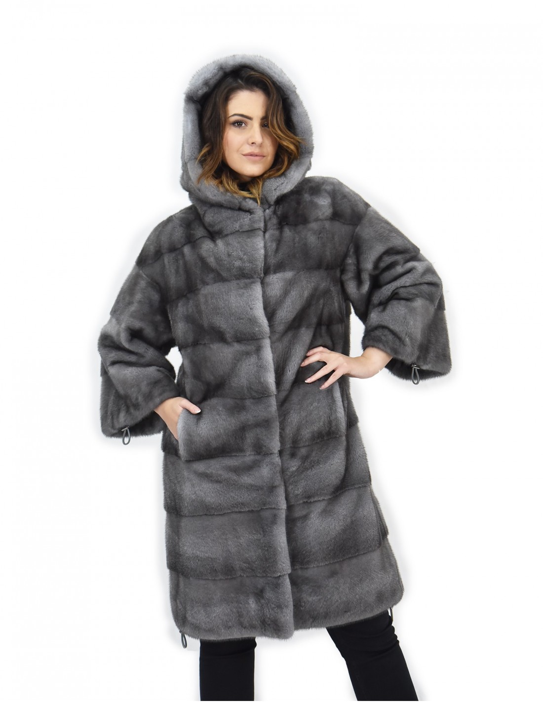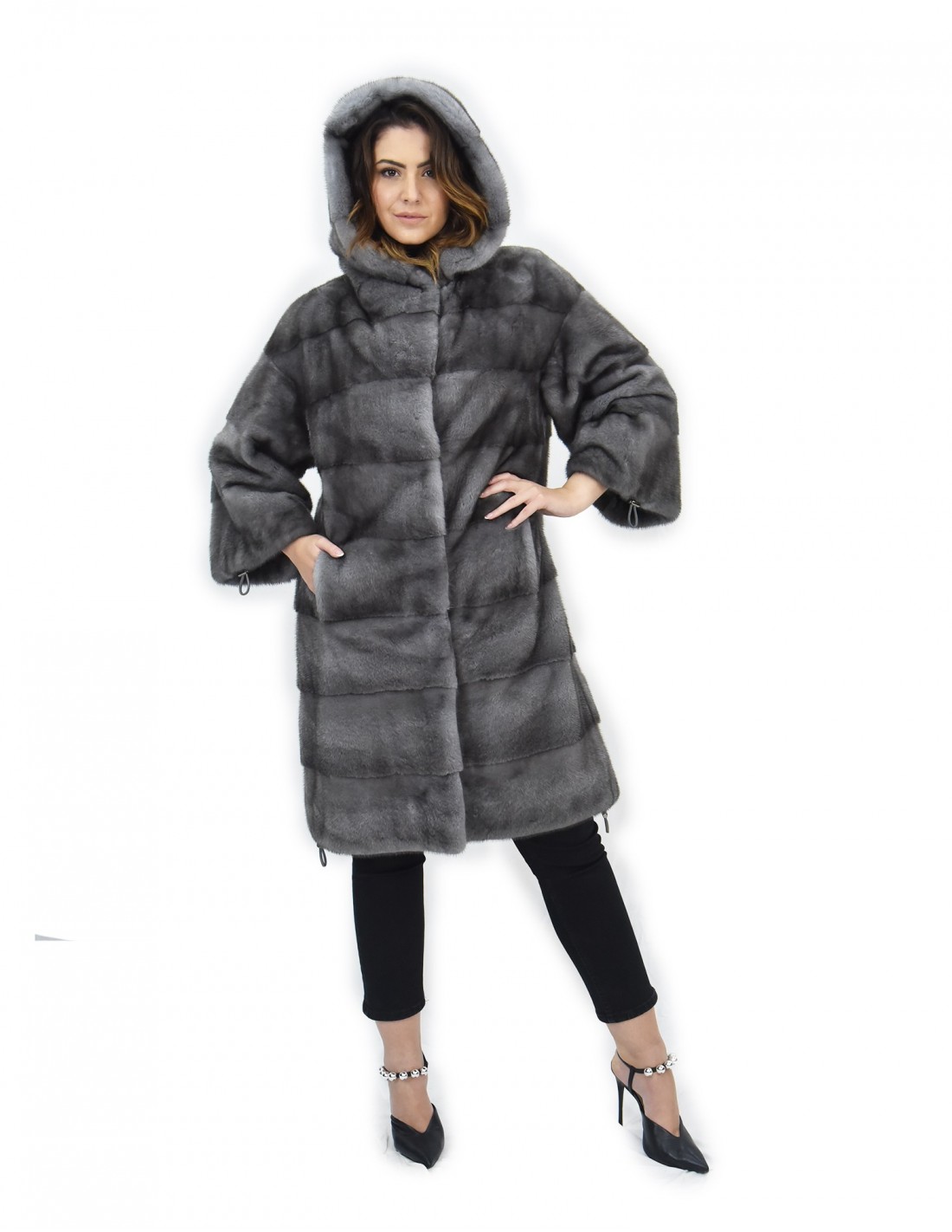{Фирменная шуба из цельной норки Manakas Frankfurt. Наши норковые шубы производятся в наших мастерских, поэтому это уникальная и эксклюзивная норковая шуба. Возможность производить наши меха высочайшего качества позволяет нам делать предложения по разным ценам в разных случаях по низким ценам, которые всегда доступны. Кроме того, наши лаборатории и наше сотрудничество гарантируют бесспорное качество норкового меха 100% итальянского производства. Для этого используется мех норки — Kopenhagen Fur. Шуба из норки с синим ирисом выпускается в модели длиной 104 см, с красивым капюшоном на подкладке из норковой шкуры, рукавами три четверти с завязками на манжетах для трансформации посадки, а также кулиской внизу, полностью из норкового меха. шкуры горизонтальная обработка, застежка на крючок и обычные внешние карманы.