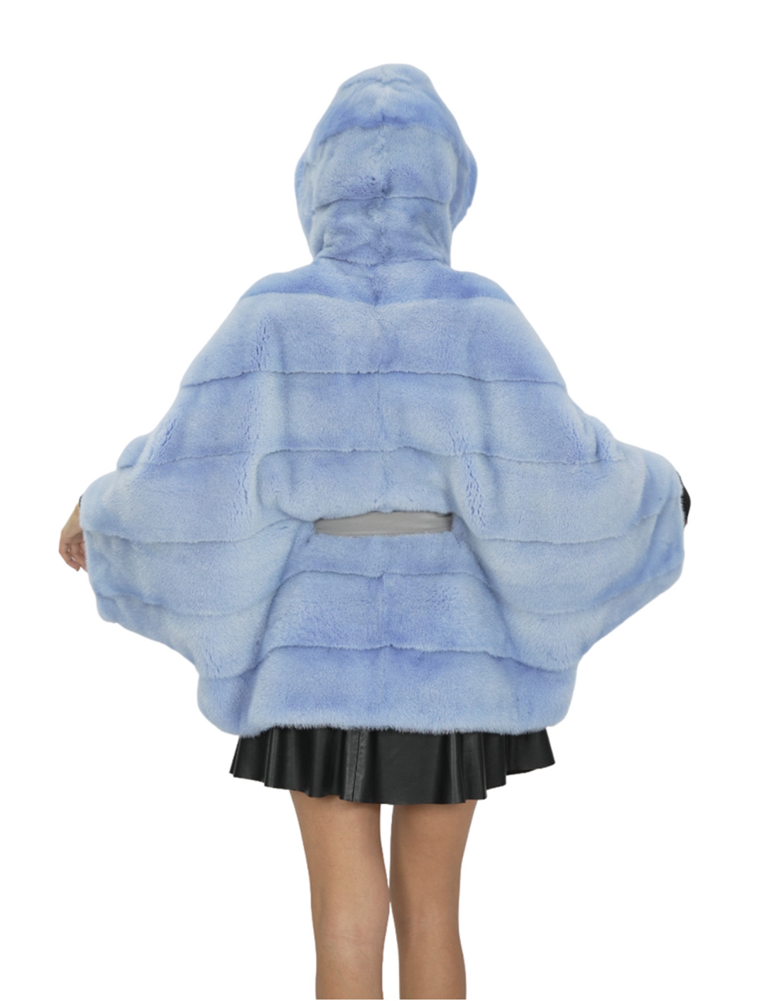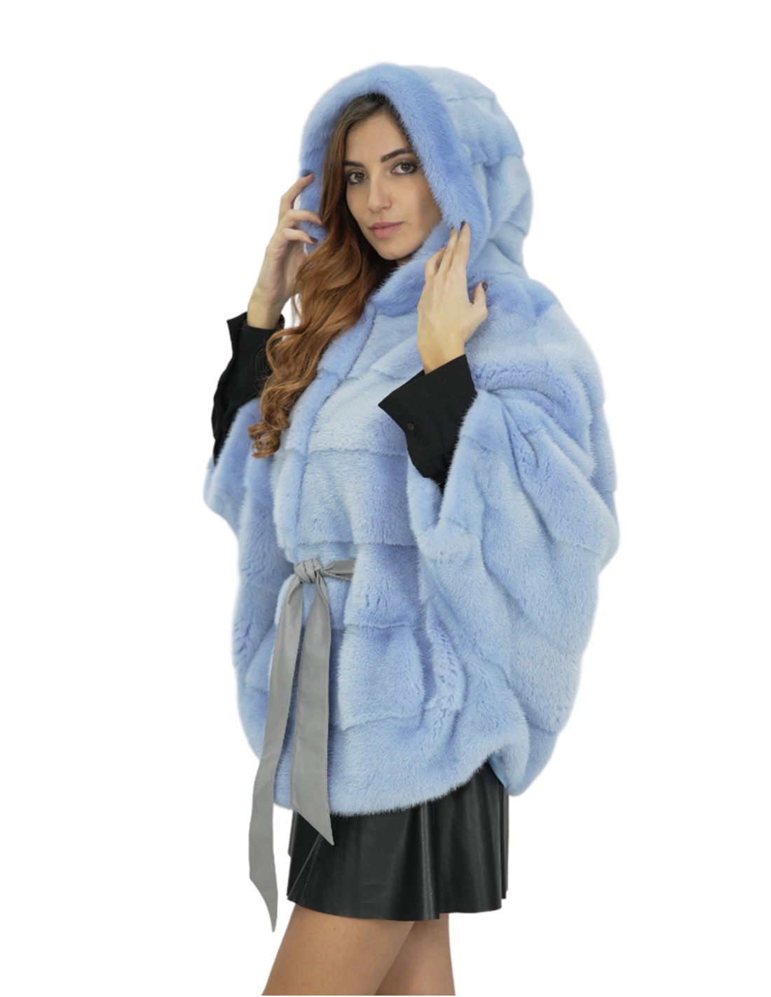 Светло-голубая накидка с капюшоном 48/54 Мех Норка Горизонтальный мех с капюшоном на подкладке