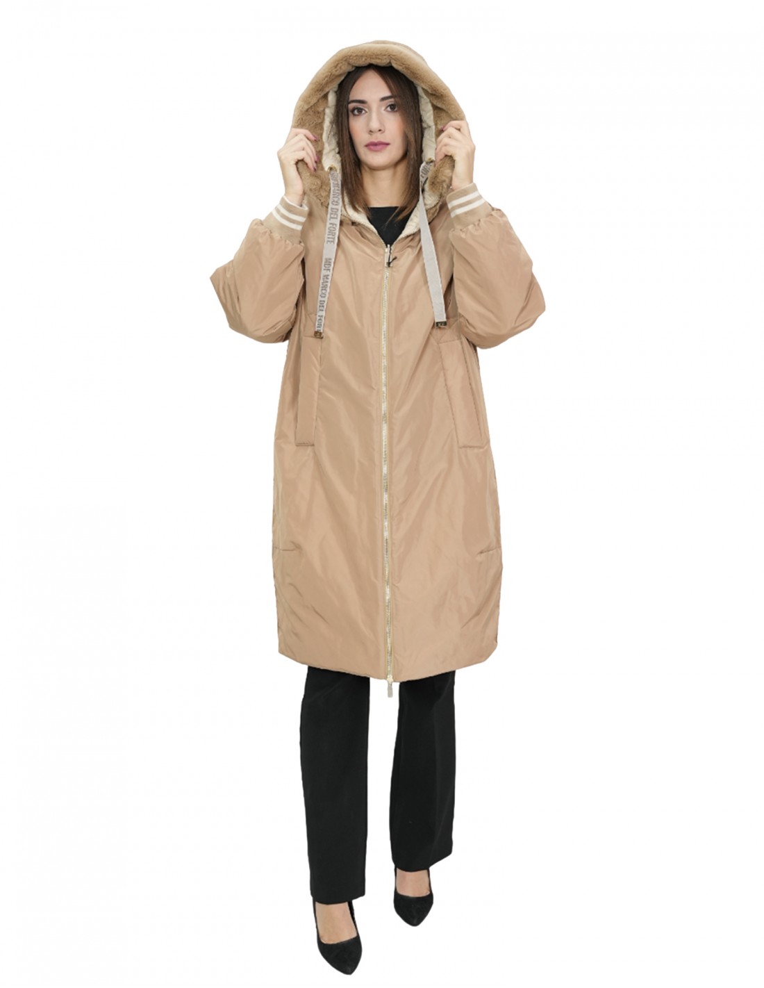 Двусторонний пуховик и плащ с капюшоном из овчины, застежкой-молнией и внешними карманами, видимыми с одной стороны и невидимыми с другой стороны на молнии, длинными рукавами с манжетами-бомберами из эластичной ткани.
