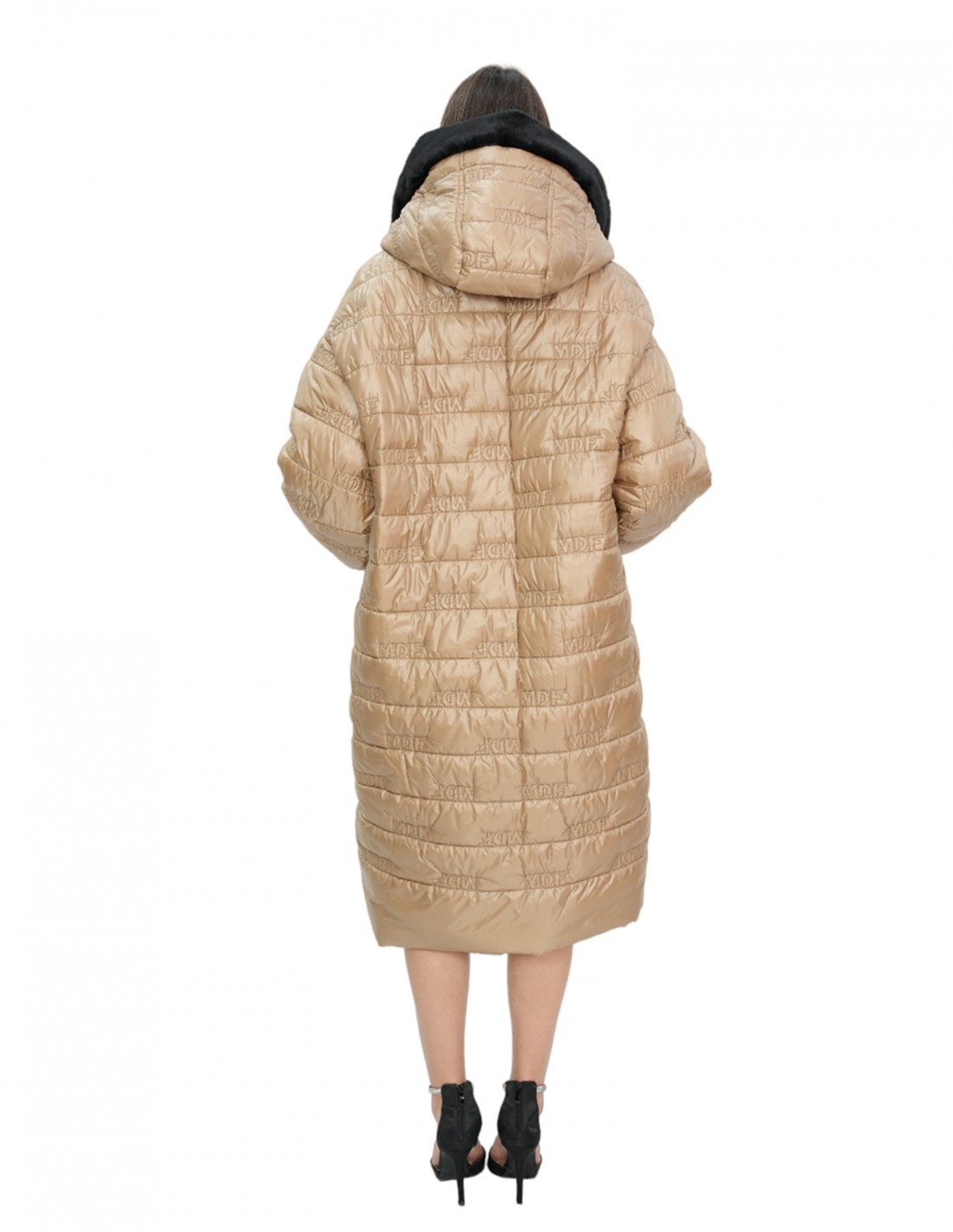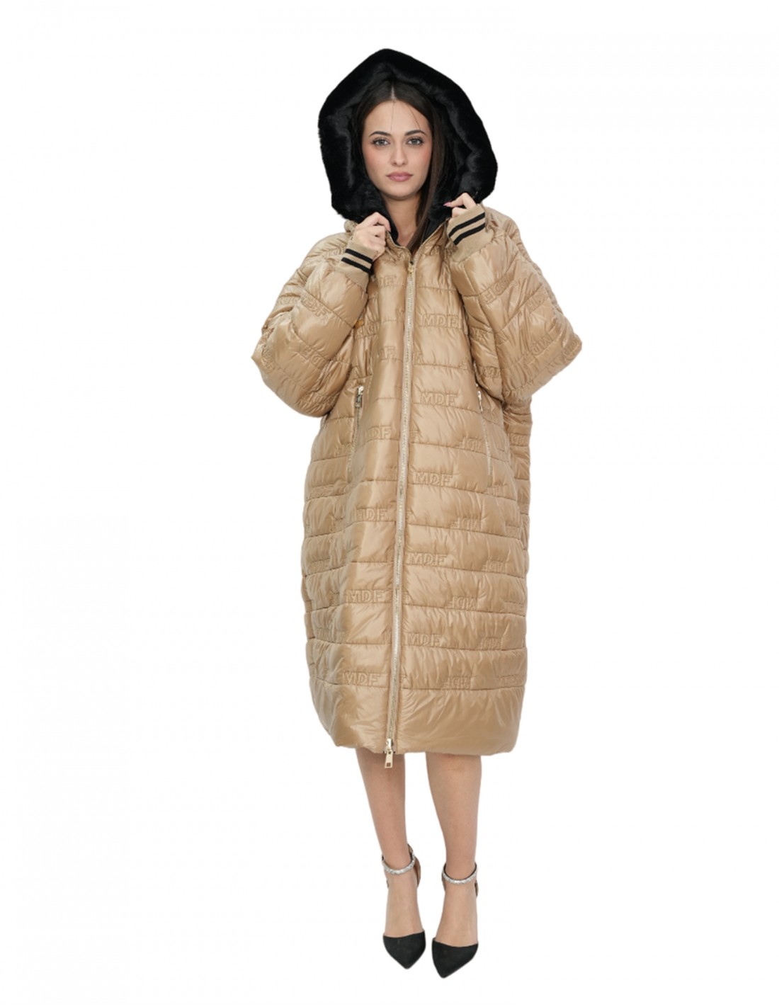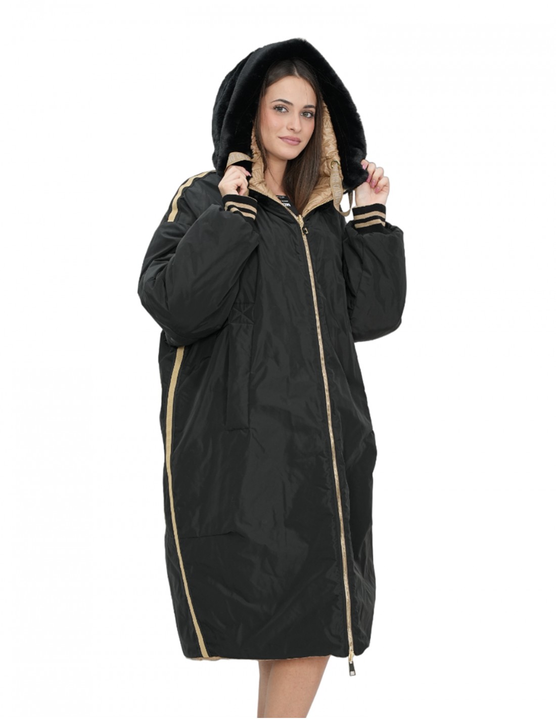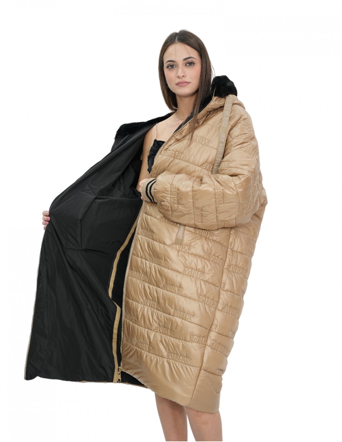 Двусторонний пуховик и плащ с капюшоном из овчины, застежкой-молнией и внешними карманами, видимыми с одной стороны и невидимыми с другой стороны на молнии, длинными рукавами с манжетами-бомберами из эластичной ткани.