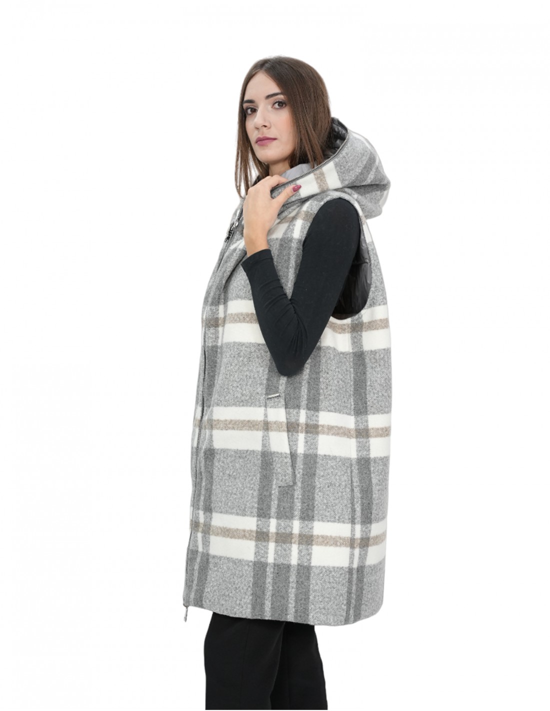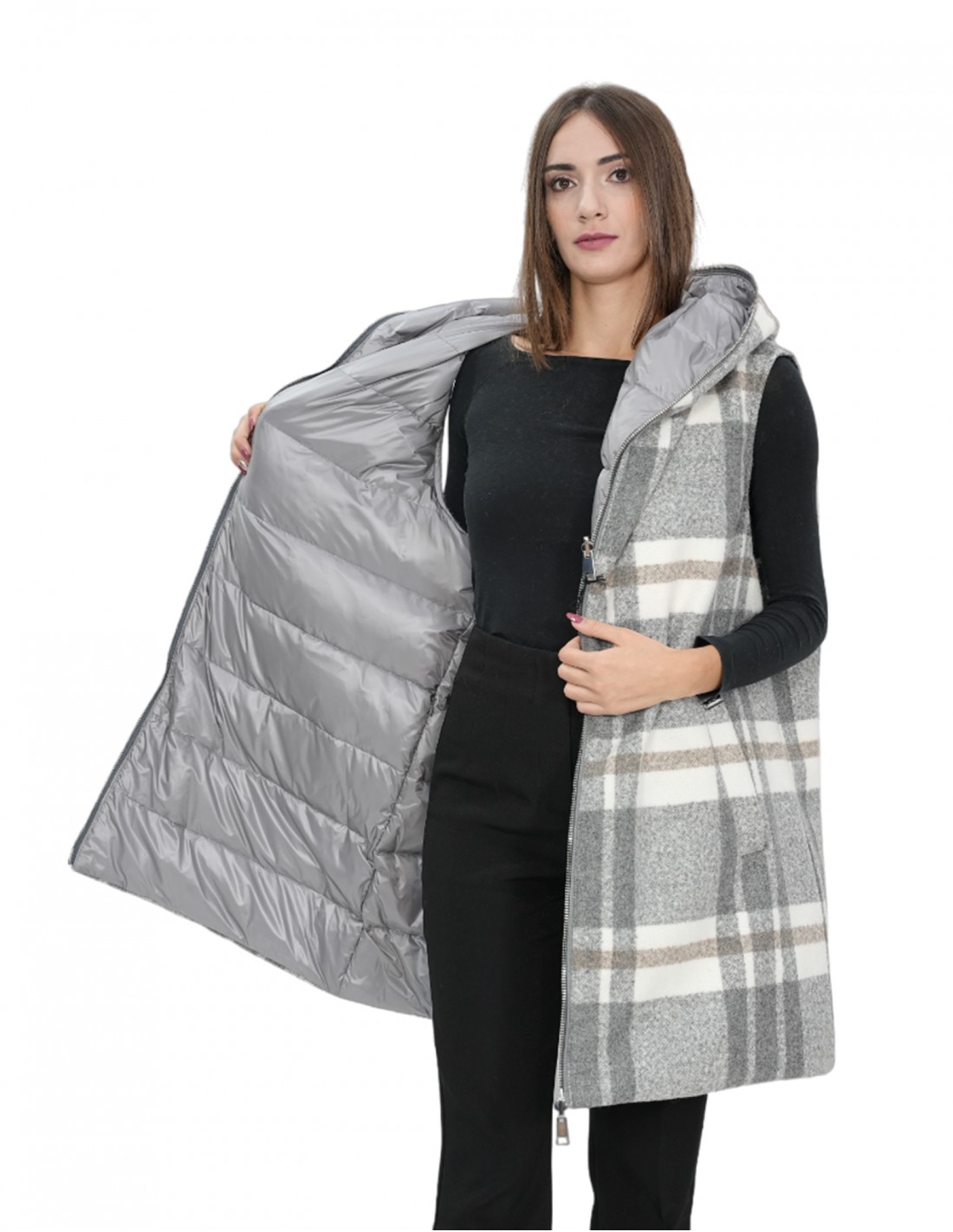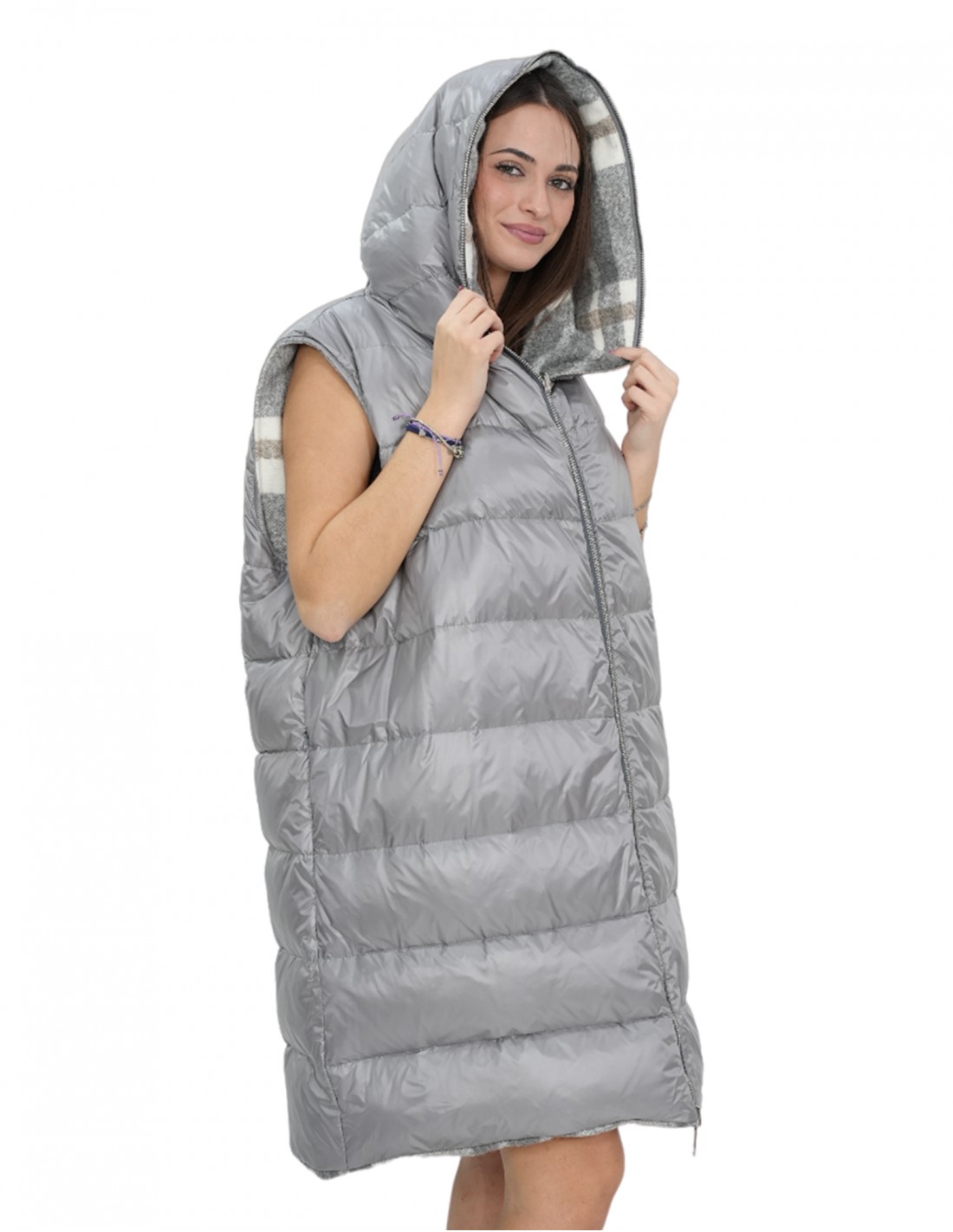Двусторонний жилет без рукавов 52 серого цвета в клетку с одной стороны и пуховик с другой стороны с капюшоном и молнией