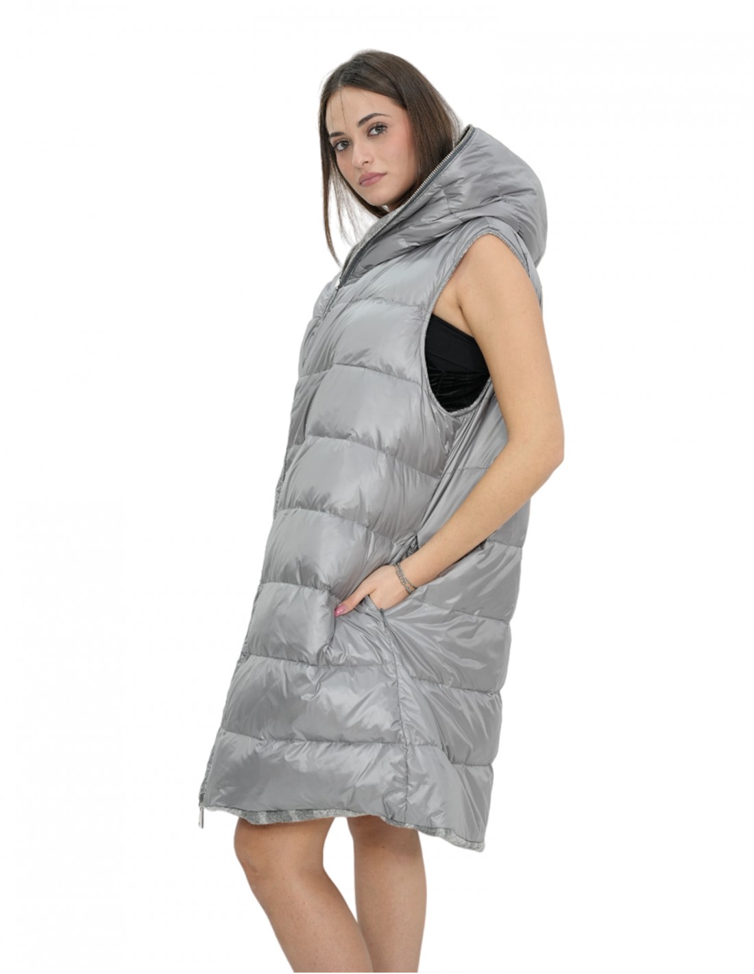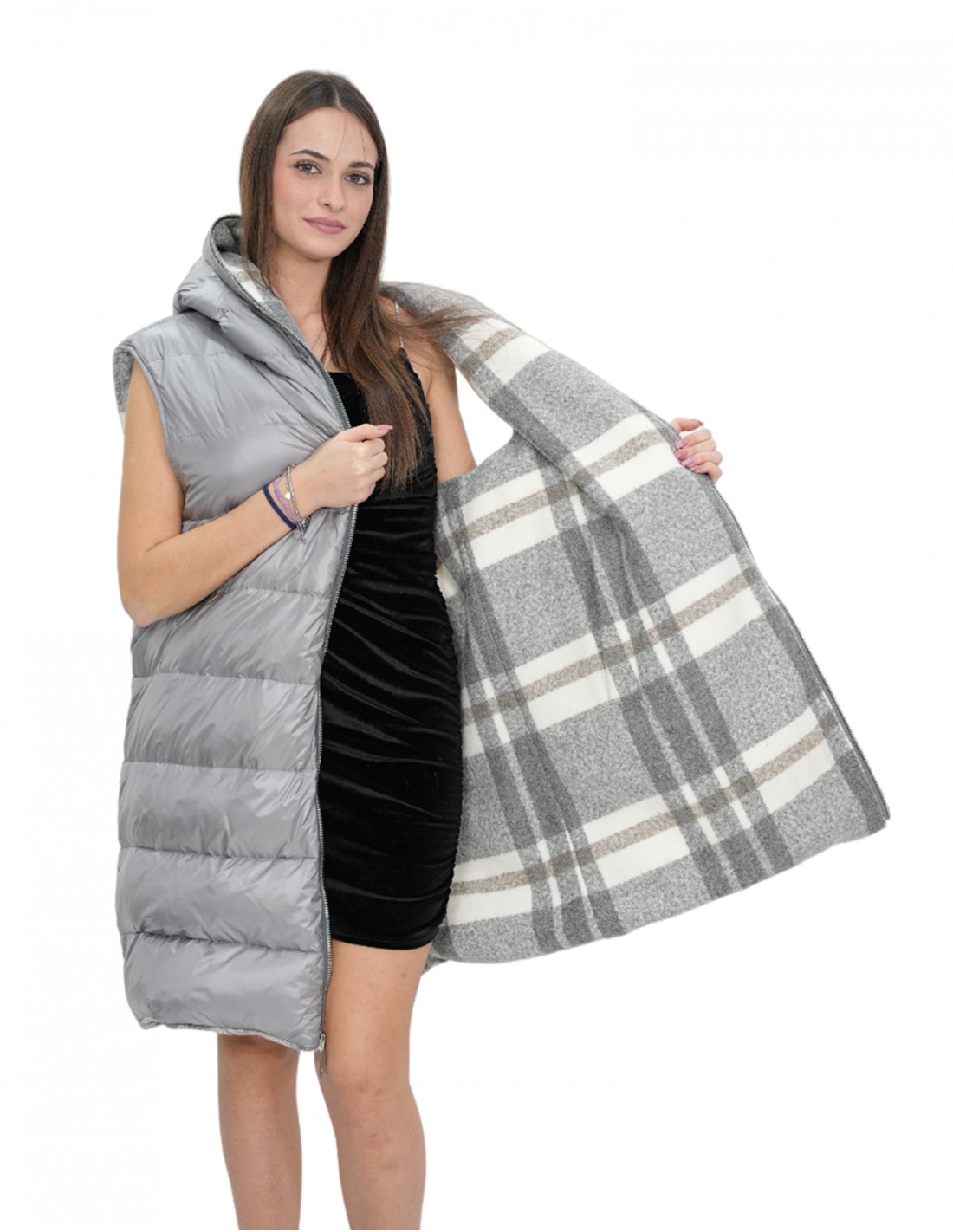 Жилет без рукавов из шерсти и пуха имеет декоративную молнию, возвышающуюся над капюшоном и окаймляющую его, внешние карманы длиной 92 сантиметра. Жилет двусторонний: одна сторона полностью выполнена из клетчатой шерсти, а другая — полностью из пуха серого цвета.