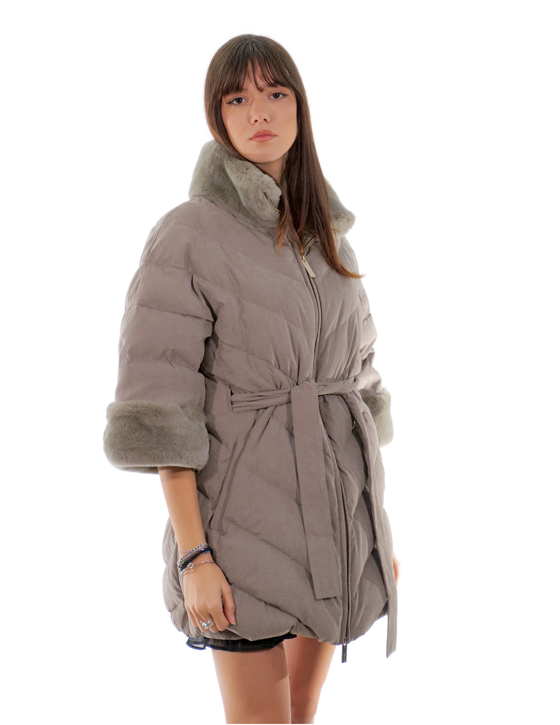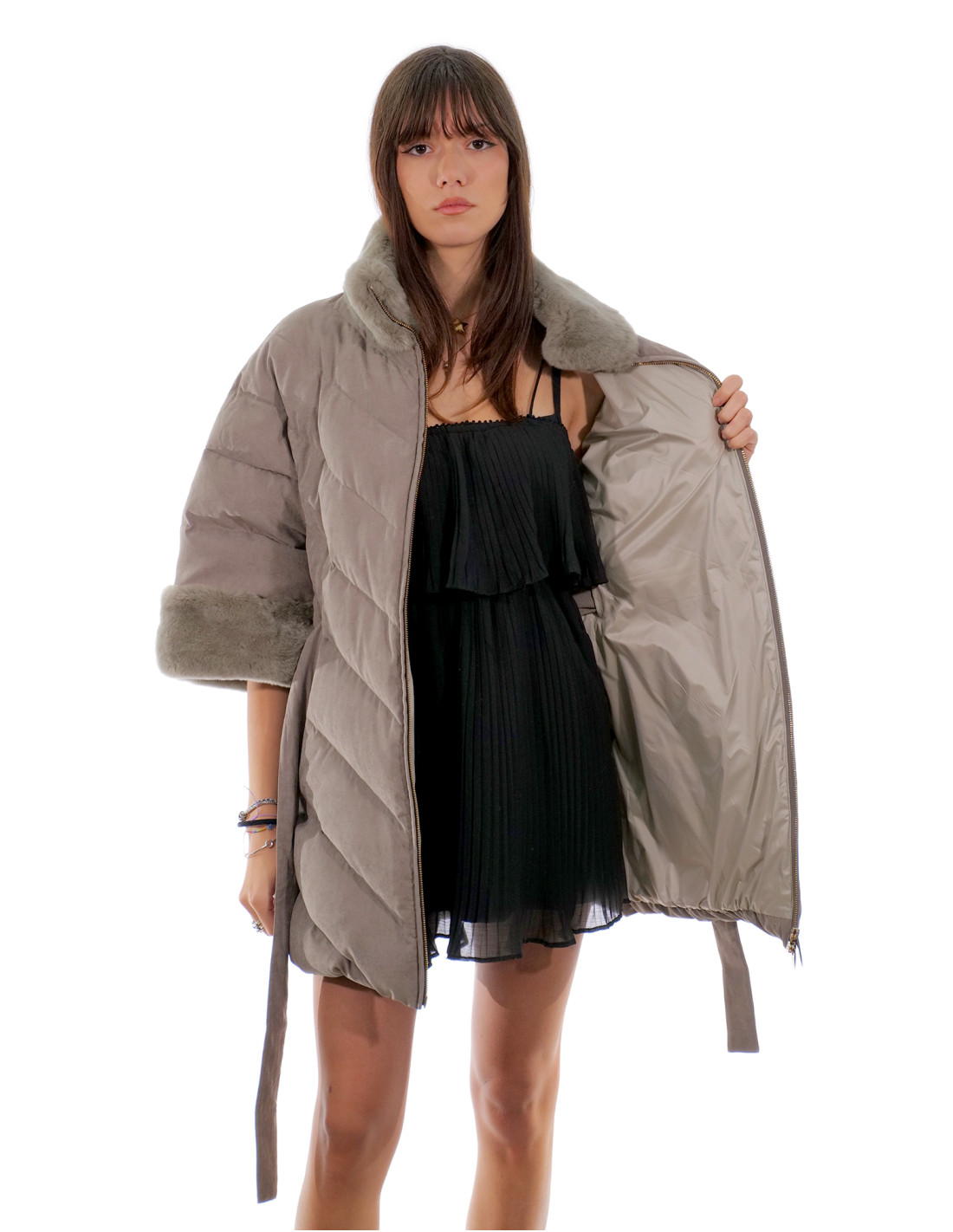 Пальто из мягкой технической ткани, пуховик из натурального пера с воротником и манжетами из меха рекса, дополнительные внешние шерстяные рукава с входом для большого пальца, застежка-молния, внешние карманы, внутренний ремень с серебряной подкладкой, все серого цвета.