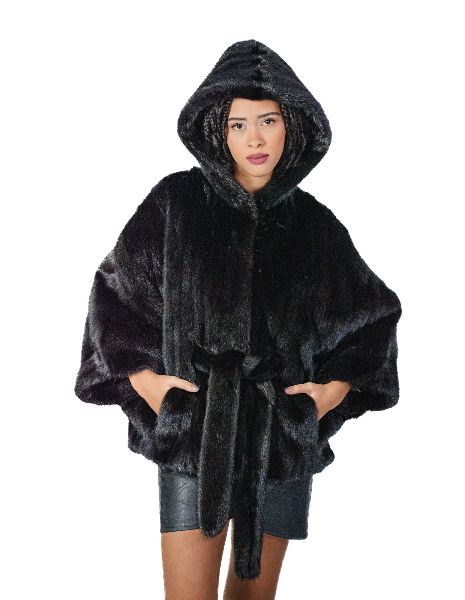 Накидка, которая подходит для нескольких размеров, хорошо сидит на девушках от 46 до 52, но также подойдет и на девушках 42 или 62, имеет вертикально обработанный мех норки, капюшон, подбитый мехом норки, внутренний норковый пояс, внешние карманы, застежку-крючок и глазки, все в черном цвете.