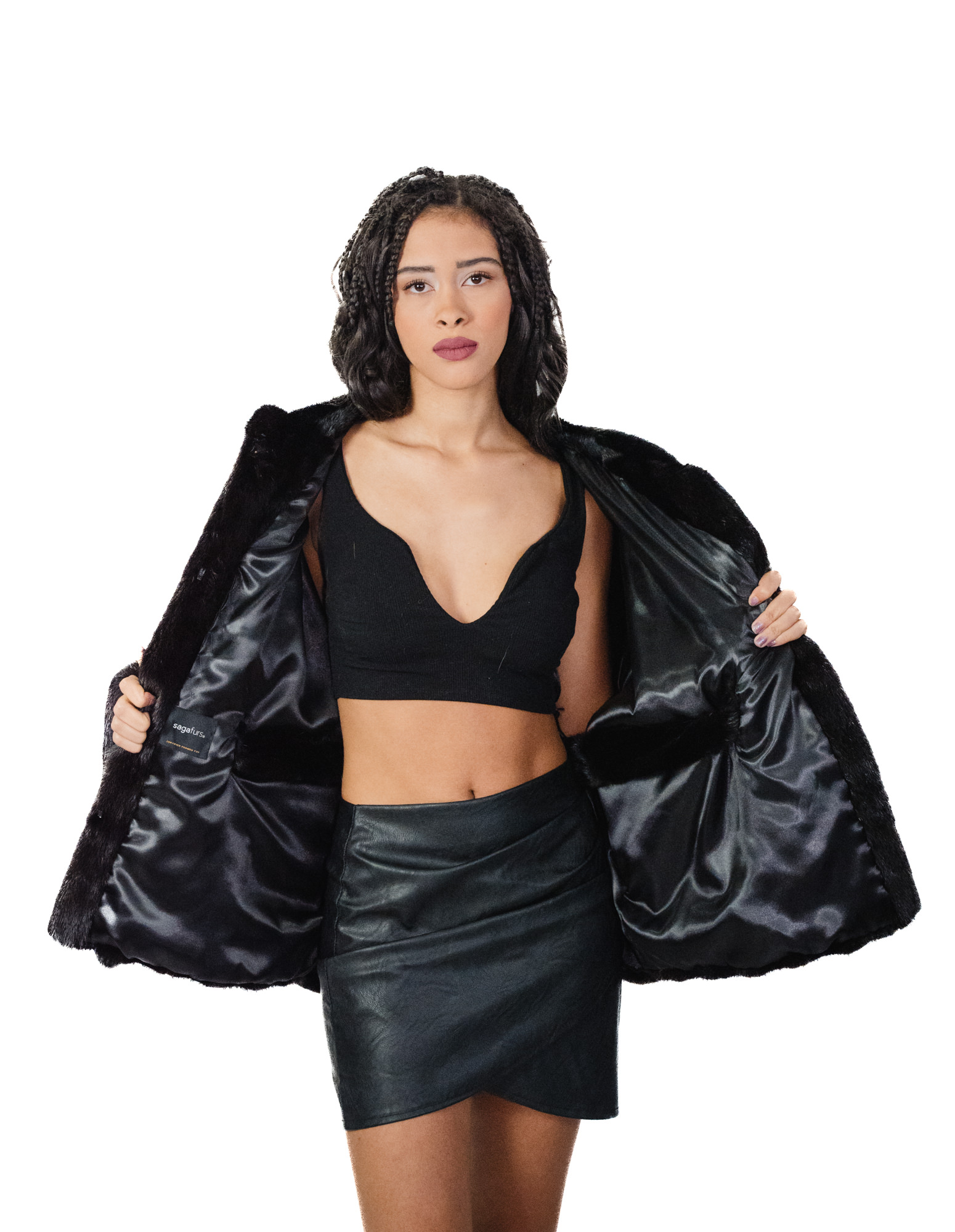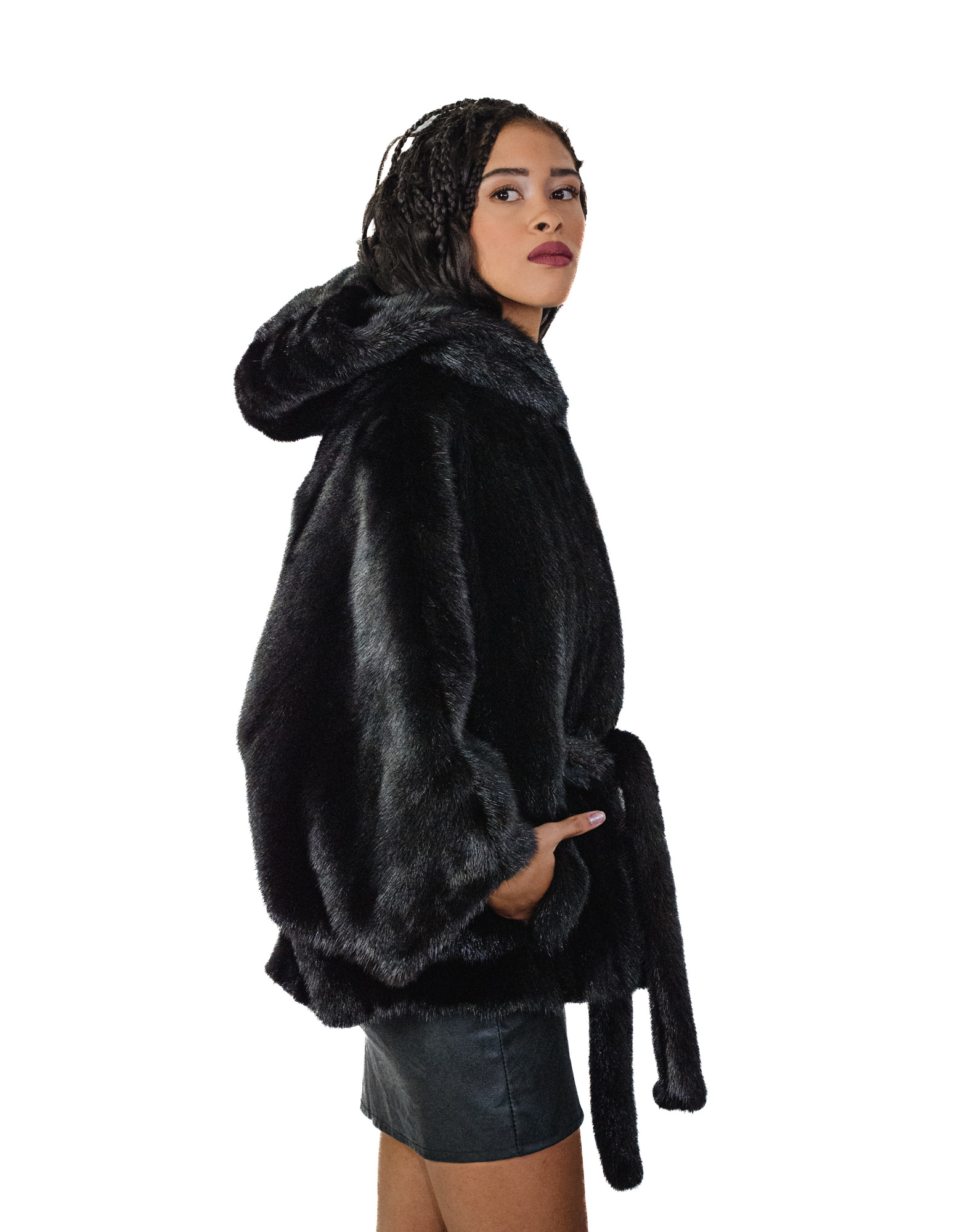 Home » Магазин » Черная норковая накидка 46-52 с вертикальной обработкой капюшона и внутренним меховым поясом наружные карманы