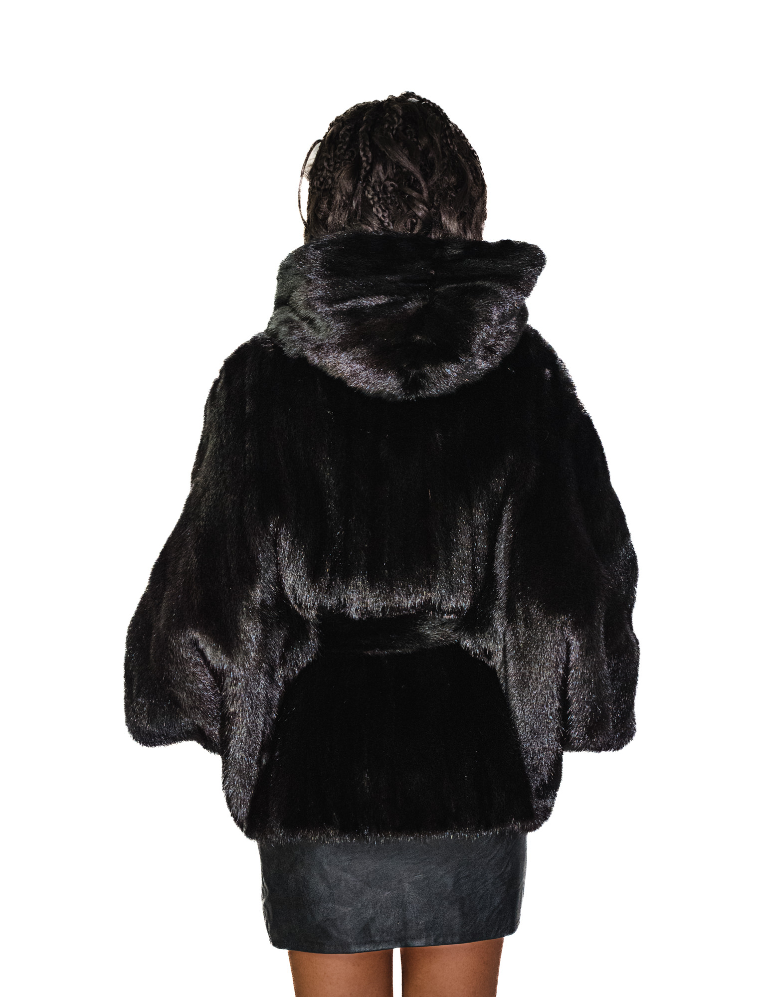 Черная норковая накидка 46-52 с вертикальной обработкой капюшона и внутренним меховым поясом наружные карманы