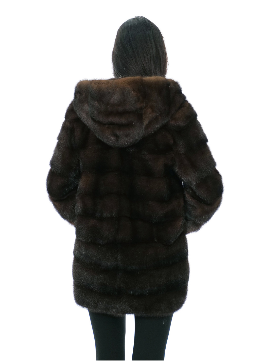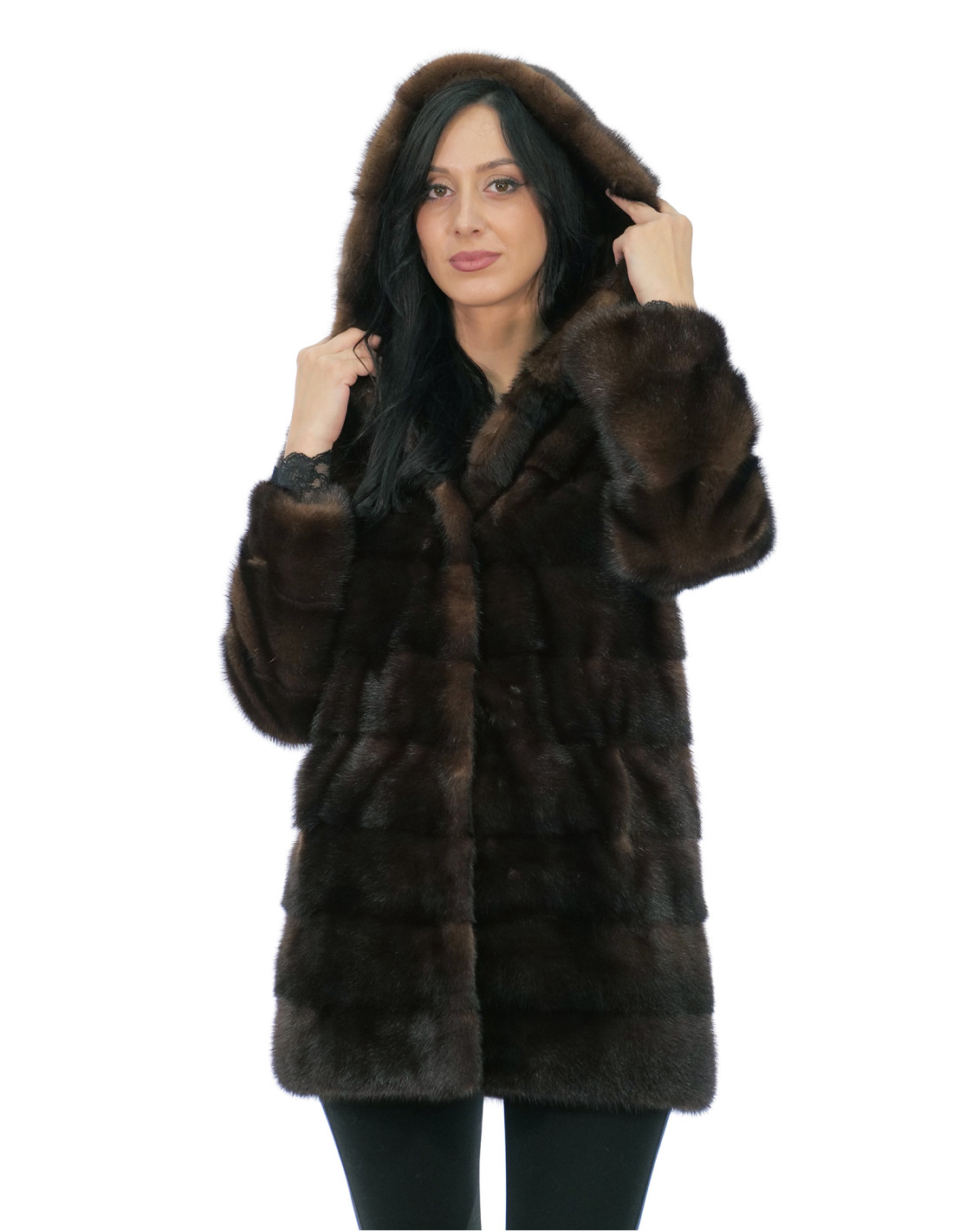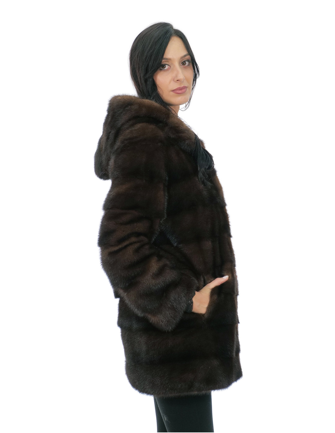 Шуба из цельной норки горизонтальной выделки. Наши норковые меха производятся в наших лабораториях, поэтому норковая куртка уникальна и эксклюзивна. Возможность производить меха высочайшего качества позволяет нам делать предложения по разным ценам, причем на различные случаи жизни всегда доступны низкие цены. Кроме того, наши лаборатории и наше сотрудничество гарантируют бесспорное качество норки, 100% произведенной в Италии. Для этой модели использована качественная норковая самка с маркировкой InModa Pellicceria. Горизонтально обработанная норковая шуба длиной 74 см имеет внешние карманы, внутреннюю завязку на талии, застежку на крючки и капюшон с подкладкой из меха норки. Все изделия выполнены в цвете красного дерева.